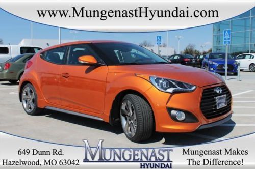 Veloster Turbo w/Black, 3D Hatchback, 1.6L I4 DGI DOHC 16V Turbocharged, 6-Speed Automatic with Shiftronic, FWD, Vitamin C Pearl, and Blk Leather. Confused about which vehicle to buy? Well look no further than this outstanding-looking and fun 2014 Hyundai Veloster. You will just love all the cargo room in the hatch of this Veloster. Pack up your gear and head for the hills, or the beach or the links. Wherever the mood takes you. Experience the Mungenast Difference! Visit us at mungenasthyundai.com. Mungenast Hyundai in Hazelwood just off of North Lindbergh and I-270 at 649 Dunn Rd, Hazelwood, MO 63042 888-212-1161 St Louis's Low-Priced Volume Hyundai Dealer! Remember, Hyundai makes the car, Mungenast makes the difference!Prices do not include additional fees and costs of closing, including government fees and taxes, any finance charges, any dealer fees, any emissions testing fees or other fees. All prices, specifications and availability subject to change without notice. Contact dealer for most current information. Advertised price includes all available factory and dealership rebates and discounts. See Mungenast Hyundai for complete details. This offer includes all rebates and dealer cash back to the dealer. Includes the $2000 HMF Bonus cash so this offer in not available with 0% financing. Includes Valued Owner Rebate of $500 and Military Rebate of $500. See a Mungenast Sales Associate for complete details and requirements for rebates. All Dealer Installed Accessories are extra. Come Experience the Mungenast Difference at Mungenast Hyundai. St Louis' Low Price Volume Hyundai Dealership. View the new prices at MungenastHyundai.com At 270 and N. Lindberg on Dunn Rd in Hazelwood, MO. Remember Hyundai Makes the Car, Mungenast Makes the Difference! 888-212-1161