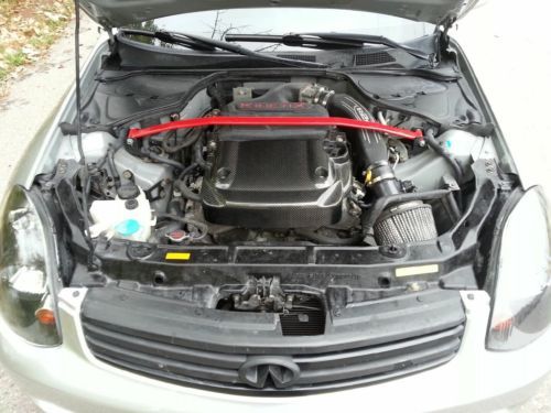 This posting is for a Silver 2003 Infiniti G35 that has been professionally modified by a ASE certified mechanic. Here is a list of the modifications done: 1. Has 4 corner adjustable BC racing coil overs 2. Lowered about 2 inches 3. Has full set of Nismo 19x8 racing rims powder coated black(2400$) 4. Falken Azeni low profile tires about 6500 miles almost new 5. Nismo full body kit 6. Tinted windows 20% all sides and windshields 7. Front grill has been plastidipped flat black 8. Brakes are red Brembo calipers with Stoptech slotted rotors and Project Mu brake pads 9. 3" racing exhaust with OEM g37 y-pipe 10. Kinetix cold air intake 11. Has a ACT Prolite flywheel and a ACT HD racing clutch(3000$) when replaced also replaced throw out bearing, seals, and put high end trans fluid (MT-90) only 8000 miles 12. Has upgraded seats to the Infiniti g37 coupe power seats 13. Reclining rear seats 14. Has a double din 7" aftermarket Alpine head unit 15. Sunroof also tinted and no leaking 16. Carbon fiber engine dress kit 17. Headlight housings painted black I'm sure there is more that I'm forgetting I purchased the car last year in Louisville, Kentucky and it has not yet seen a Michigan winter. There are no junk parts on this car, all high end reputable parts. Only owned by mechanics who baby their cars since the second owner. There are no dents or paint chips other than a few minor ones on the bottom of the front bumper. There is no rust because it was a southern car until last year so no salt or snow. The car has mainly highway miles from the original owner. The second owner used it as a weekend cruiser only and it was his baby. He was a certified ASE mechanic and did all the work himself in a professional shop. The car has always had Mobil 1 full synthetic oil which I just had changed last week. I am the third owner and have taken very good care of the car myself. I am also studying to be a mechanic, so I am very meticulous about my cars. Price is $12,500 obo cash is king I have the title in hand clean green Michigan title. Don't need the money so no low ballers it's a great car in excellent condition. Non-smoker car. Miles will go up slightly because it is my daily driver. If you have any questions message I will respond as soon as I can. You can also come look at the car if interested but please don't waist my time, or expect joy rides. Can send more pictures or will upload later. |