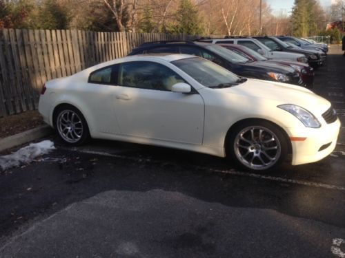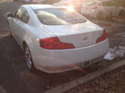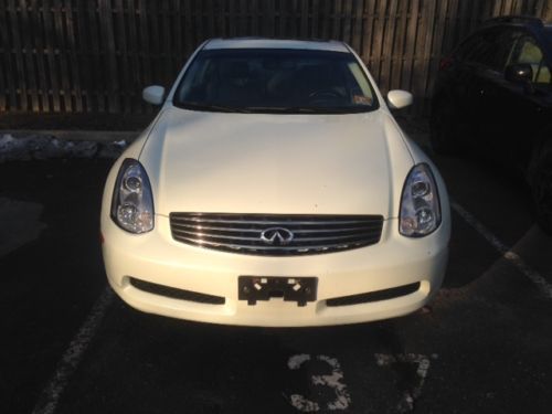 offered to the public pre auction wholesale a very nice Infinity coupe in pearl white with light tan stitched leather interior. Non smoker interior with super options and new jersey inspectged until 2015. Only defect as shown in picture is a strip of paint missing above drivers door . no engine lights runs strong looks great at a great low price at less than average driven miles . carfax upon emailed request . Thanks for looking