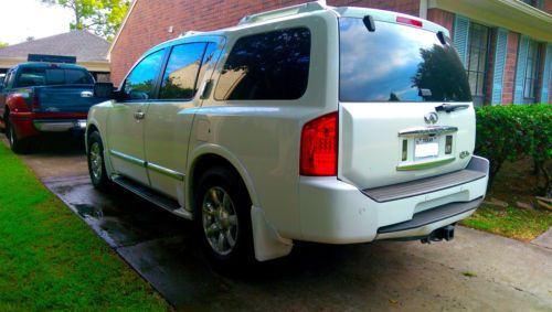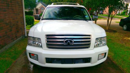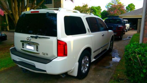 NO RESERVE AUCTION!!! HIGH BID WINS!!! PLACED FOR SALE FOR THE FINAL TIME IS MY 2005 INFINITI QX56 LUXURY SUV. THIS VEHICLE IS ONE OF THE NICEST SUV'S ON THE ROAD TODAY. RIDES MUCH BETTER THAN MY RANGE ROVER IN MY OPINION. VERY ROOMY, VERY COMFORTABLE, AND DRIVES VERY SMOOTH, POWERFUL, EFFICIENTLY. HAS ALL LEATHER, FACTORY DVD SYSTEM, NAVIGATION, THIRD ROW SEATING, CD, AM/FM, CRUISE, PDL, PW,PB, HEATED SEATS, MOONROOF, MEMORY SEATING, KEYLESS REMOTE ENTRY, WIRELESS HEADSETS, BACKUP CAMERA, PLUS A WHOLE LOT MORE. I HAVE 218,184 MILES ON THIS VEHICLE AND JUST RETURNED FROM A 2000 MILE ROAD TRIP WHERE IT PERFORMED FLAWLESSLY. THE TRUCK HAS BEEN WELL MAINTAINED, STILL RUNS LIKE BRAND NEW. HAS FRESH OIL CHANGE. WILL NEED A BANK 2 O2 SENSOR BUT ALL ELSE WORKS. NO RIPS OR TEARS IN LEATHER OR CARPET. TYPICAL ROCK CHIPS ON FRONT BUMPER COVER. THIS SUV HAS PLENTY OF LIFE LEFT AND COULD MAKE SOMEONE A VERY NICE ADDITION. HIGH OR ONLY BID WINS, PERIOD! IF I ONLY GET ONE BID SO BE IT, IT'S GONE!!! CURRENT TEXAS VEHICLE REGISTRATION AND VEHICLE INSPECTION CERTIFICATE. VERY NICE FAMILY VEHICLE FOR THE KIDS. CHECK OUT THE NADA BOOK VALUE 2005 Infiniti QX56-V8-AWDUtility 4D 2WD
