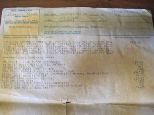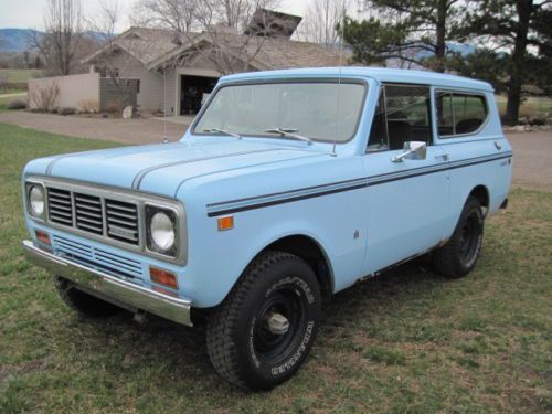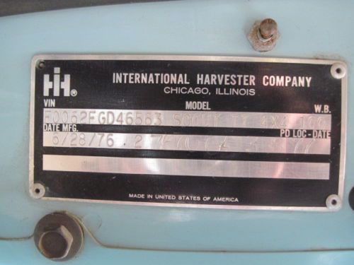 Well I'm sure no expert on International Scouts, but a friend of mines father bought this 1976 Scout brand new. He died a year or so ago and I ended up buying it from his daughter.(it is basicaly a one owner vehicle). This scout truely looks, runs, and drives like an old mans car. Although not perfect, it was garaged most of it's life and was well cared for since day one. The biggest issue on this Scout is that it has some rust in the Rockers.(typical scout weakness). The rest of the body is mostly excellent. It has the 4 cyl. engine which is said to be "under- powered". However...it's saving grace is that it was ordered with the factory 4 speed, as well as power disc brakes. A friend of mine put 275,00 miles on one just like this.(they are very under-stressed and run forever). This Scout has new tiers, as well as a new battery. It has manual steering so it drives like a truck. I have the factory window sticker as well as the owners manual. The interior looks like that "army green color" I can tell you that it runs and drives excellent. This vehicle is almost 40 years old and I am selling it as- is. I would much rather you plan for the worst and hope for the best than be disappointed in anyway. I have a clear and open Colorado title for it. My opening bid is 3,750.00 with no reserve... Now all this having been said... I honestly can't imagine finding a nicer or more original,or low mileage or more un-molested Scout like this for the price. . This is just how I received it.. I have no doubts that it could be driven anywhere at anytime.(just my opinion). I only want the buyer to be as excited as I was when I found it. I think that whomever ends up with this Scout will be very happy...just my thoughts. Terms of sale... I can not ship..... This means I can not crate, box, disassemble, or deliver to a shipping company. I will however be more than happy to assist your shipper, however I can. A $200.00 non-refundable deposit through Pay Pal is required within 48 hours of auction's end. PayPal is acceptable for the deposit only. The balance is due via bank/certified check, or cash in person within 7 days of the auctions end. If you are an out of the states buyer, I will gladly work with you in regards to the time and details it takes to process payment. |