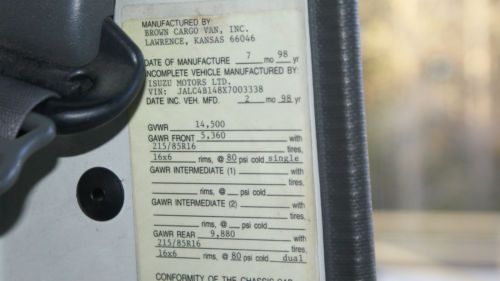 Standard Cab; 4 cylinder turbo diesel Isuzu Engine 175 hp; 64,051 mi. only!!! Automatic OD; Spring Suspension; 16 ft Length x 96 in Width x 7 ft 8 in Height; Roll up Door; 215/85-16 Tires; Steel Disc Wheels; Single Axle;Truck runs good! Tires are 95% front and 55% rear. New injectors
