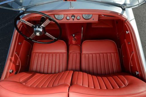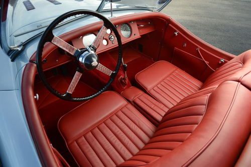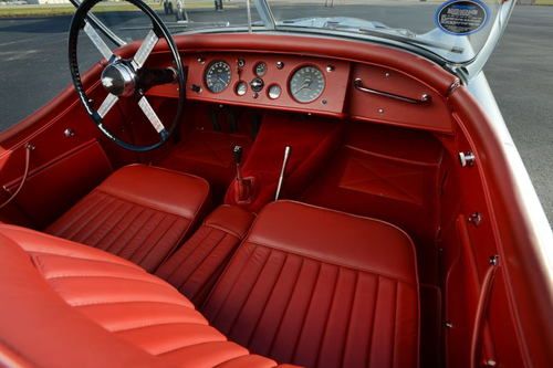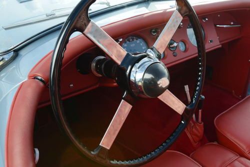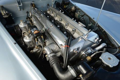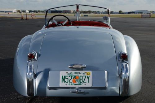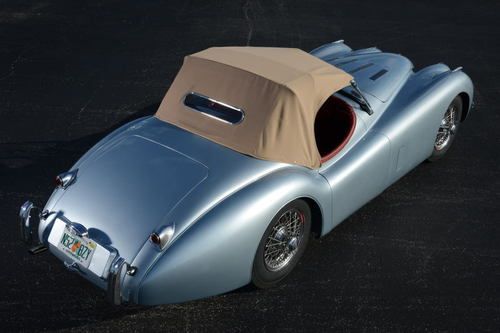 1952 Jaguar 120 Roadster with 21,400 miles. Jaguar Heritage Certificate. Silver blue exterior, red leather interior. Frame off nut and bolt restoration documented with lots of pictures. Stainless steel and brass sleeved brakes, aluminum gas tank, stainless steel exhaust system, 12 volt single battery conversion, electronic ignition system, new chrome wire wheels with new radial tires. Engine, transmission and body have matching numbers with Heritage Certificate, rebuilt with all new parts including original new oil pump. All engine parts balanced. Runs and idles beautifully. Transmission and rear axle rebuilt with new bearings and seals. Alloy doors rebuilt with new heavy gauge structural interior door frames. Body sandblasted on rotisserie, and repainted with high quality primer and finish paint. Frame repainted with black emron paint. All wheels have new bearings and brakes. New wiring harness. New leather interior with Wilton carpets. Seat frames rebuilt. New beige canvas convertible top and new side curtains. A BEAUTIFUL JAGUAR 120 ROADSTER. Restored by German craftsman. Shipping in the US and overseas can be arranged.