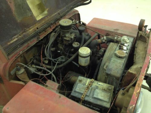 1946 Jeep CJ2A. Title in Hand. Has Rare pto drive. Original motor has been replaced by a F134 (super hurricane) F head engine. Engine does not run, but turns over. It appears to have been converted to 12 volt, but am not sure. Brakes not functioning. Body is in so-so condition and right front frame is broken. This is not uncommon and a replacement part is available (about 18 inches of the frame). It has a couple of doors that came with it but I don't think they are correct. Transmission, transfer case and pto box all shift.