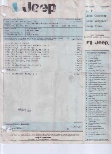 Up for auction is this 3 speed 1975 CJ5 Jeep I purchased in Washington, OR in 2005. I drove it 1,600 miles back to Iowa with no problems! It has the stock 258 six cylinder engine (not the 232) and had 69,000 miles on it. I am the 4th owner. It was originally passed down from Grandfather to Grandson in 1991 with 23,000 miles, and sold to the gentleman I bought it from with 47,000 miles. It had been repainted from the original white to dark metallic blue. Custom features include stainless bumpers, bumper guards, body hardware and interior grab bar. It has a Swing Away Spare Tire Carrier. Wheel Rims are 15x8 5/5-1/2 (#164 Ultra) polished aluminum with s/s center caps. Included are the Original Window Sticker, 1975 Owner’s Manual, Warranty Pamphlets, original Repair Receipts, and Ads used to sell this jeep. Also included are Moses Ludel’s Jeep CJ Rebuilder’s Manual 1972-1986, Chilton’s Repair & Tune Up Guide 1947-1987. This jeep is in good mechanical condition and has a plenty of power. I would not hesitate to drive it back from Oregon again. It does burn a little oil and I suspect that someday it will need the rings replaced. The biggest problem is that it has sat outside and developed rust in the quarters and on the driver’s floor boards. Of course the pictures will make the jeep appear better than it is. The left upper plastic door window has a foot long tear. The Bestop soft top is old but in pretty fair condition but will eventually have to be replaced. The front seats had tears in them when I bought this jeep but see one can now buy the 1975 original appearing seats, which were unavailable for a long time. I installed a new HEI distributor a couple of years ago, and recently installed a new valve cover gasket. I had the original carburetor overhauled, as it was hard to start if it sat for more than one week. Now it starts fine. The throw out bearing complains occasionally in really cold weather. Currently, it has 76,333 miles, so I have driven it about 7,000 miles during the past eight years. It is a great winter vehicle, which is what I mainly used it for, and of course fun to drive in the summer with the doors and top off. I am selling this jeep now as I’m in my 60’s and it is becoming increasingly uncomfortable for me to get in and out of it, especially with the sight lift and it’s short wheelbase ride. This would be a nice original project to restore or customize. Like I stated above, there are looks of rust areas. Originally I paid $7500 for it, but am starting the bidding at $3,000 due to the needed rust repairs. Am selling ‘AS IS’ with no refunds or returns! Buyer must pick up Jeep and I must be paid in cash before I sign the Title and the Jeep leaves my house. Good luck bidding! 641 740 0419 Dave |