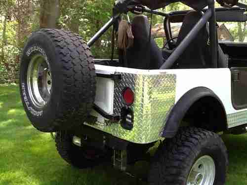 Here is a nice cj7 has a 360 AMC v8 4 spd with granny low and a Dana 300. Motor has been built in the past but I do not know the specs. It has an edelbrock intake, edelbrock carb, billet dist, MSD ing.has headers and dual exh.runs super strong. Frame is literally like new, has 6 inch lift with front reversed shackles 33 inch rubber in very nice shape . Comes with a spare but does not match. Floors where repaired . Tub has been fixed over the years but still presentable. New fiberglass windshield frame, glass has a small crack. Bestop front seats no rear seats. Jeep has a roll cage. Comes with new bikini top, soft lower doors and I have a set off full hard doors that have been trimmed to fit the roll cage. This jeep is a build from an 81 and an 86 Cj, not sure what year the 360 is. Runs nices drives like a Cj, not a jk, steering box seems to have some play,and she can use new shocks. With a little more love she is ready. Jeep is located in Warwick RI 02889 and buyer is to arrange transport. As far as driving her any distance I would rather see you put it on a trailer, I have not had it on the highway. Was going to finish it up but am going with a Willys wagon project that I just came across . Please ask any questions or Call me at 4014800377 prior to your bids if you have any. A 500.00 dep thru pay pal within 24 hrs is due, also cash or money wire transfer for balance is what I prefer. I will not take pay pal for the sale amount sorry. Thank you for looking and happy bidding this ia a no reserve listing!