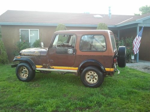 Hello, we are selling our 1981 CJ7 Renegade. The Jeep has the original 6 cylinder with a 4 speed transmission. Yes it has a few rust spots, drivers floor and both sides where the jeep symbols are, but other than that it is solid. The transmission sometimes comes out of second gear when downshifting, but has been driven like this for several thousand miles with no problem. It just passed a two year emission test. The only part that is not original is the the cd player. We have a clear title in hand. Just returned from a nine day trip to Durango,Co. and used the jeep with no issues at all. 4x4 works great in lo and hi range, does not overheat or smoke. Winch works great and comes with 15' switch. Thanks for looking and good luck bidding. Please feel free to call if you have any questions at all. 505-604-0712.