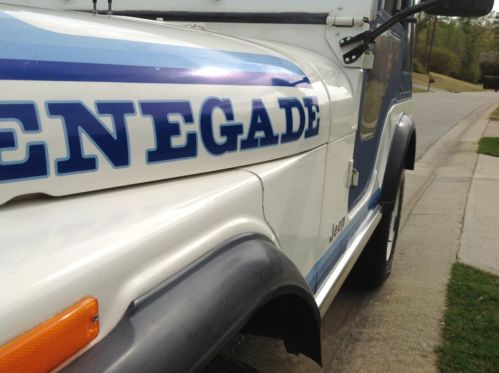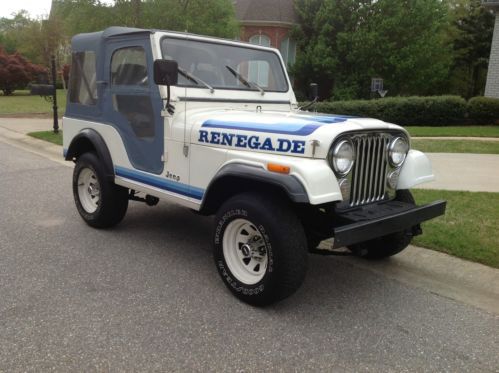 You are viewing a super solid and all original1981 CJ-5 Renegade. This Jeep was purchased new at Tupelo Datsun/American Motors in Tupelo, Mississippi. The original MSRP was $9479.00. Optional equipment is as follows, Renegade package, 258 6 cylinder engine, rear traction lock differential, power steering, power front disc brakes, tilt steering wheel, blue denim soft top, and draw bar with hitch. This CJ still wears its original Olympic white paint, Renegade stripes/decals, and blue denim Whitco soft top! It truly is an unbelievable survivor that has been untouched by its only two owners. The body is rock solid with no rust repair ever. It is laser straight too with no dents anywhere! The paint is 33 years old but still looks amazing! It is very obvious that this Jeep has been garaged and pampered its entire life! Even the original Whitco soft top looks great! There is absolutely no evidence of previous accident damage, rust repair, patch panels, bonds, etc. this Jeep really is beautiful. You could search for years and years and still not find a CJ that is this original and clean!