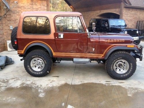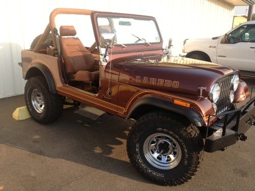 1983 Jeep CJ7 Laredo 4x4 restored with original 121k miles. Only 1,500 miles on custom Chevrolet 350 with turbo 350 auto trans and B&M shifter. All new interior, stereo, paint, decals, tires, etc... Too much to list. All restoration receipts available along with before and after pics of the restoration. Hard top, (2) bikini tops and a soft top (uninstalled). New lights/tail lights. New chrome grill and aluminum radiator. Every component on the engine is new. All the exhaust is new including the aluminum headers, pipes and mufflers. Brand new Goodyear Wrangler Duratrac 33.50 x 10.50 x 15 all terrain on JEEP OEM wagon style wheels 15 x 7 with a 5x5.5 bolt pattern. New body mounts that give the body 2" of extra clearance. Excellent condition with a clean title. Great for antique or hot rod shows. Has state inspection sticker and current antique tags. I started the restoration in 2007. Finished in 2010. This jeep is beautiful and runs very fast. This can be an every day car or just a Sunday driver. Please email with questions or send me your number and I'll call you. I will help & prepare vehicle for shipping but will not handle the logistics. This vehicle is for sale locally and therefore I reserve the right to remove the vehicle from this auction if it sells.