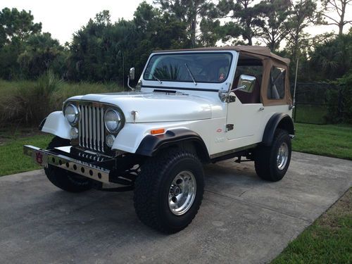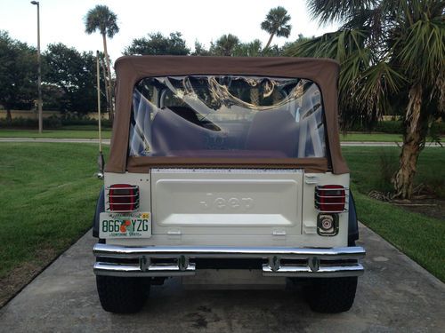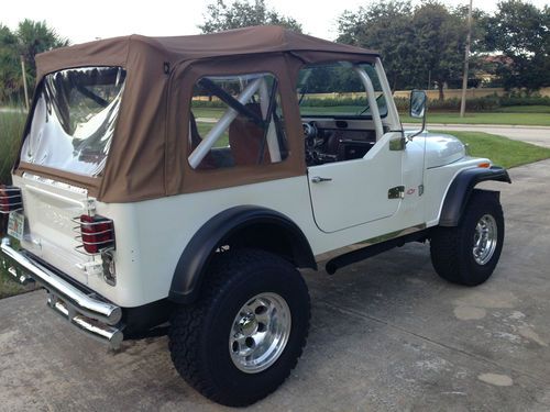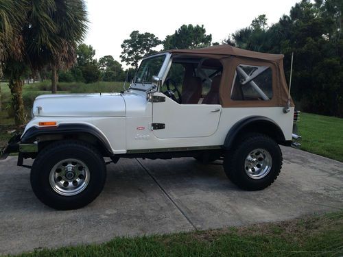WHAT YOU ARE VIEWING IS AN ORIGINAL ALL METAL 1983 CJ7, IT IS POWERED BY A GM PERFORMANCE RAMJET 350/350 FUEL INJECTED CRATE ENGINE WITH JUST OVER 18,000 MILES, ADULT OWNED, THE BODY WAS DONE IN A CUSTOM WHITE PEARL METALLIC, THIS JEEP SPARED NO EXPENSE, FROM THE NEW CAMEL INTERIOR TO THE TIRES AND RIMS THAT WERE JUST PUT ON AND HAVE 10 MILES ON THEM, THE ENTIRE FLOOR OF THE JEEP WAS RHINO LINED, THIS WAS A FRAME OFF RESTORATION, PLEASE VIEW THE PICTURES, HAVE CLOSE TO 40K INVESTED, TO MANY EXTRAS TO LIST, DONT WAIT AT THIS PRICE IT WILL BE GONE FAST!!!!