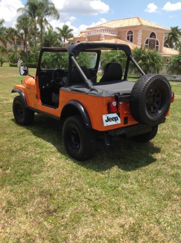 Just finished this neat 1984 CJ7 that is pretty much unmolested. Just finished a beautiful new paint job in Hugger Orange with black accent. The trim , hinges, windshield , hood, tailgate etc.....were all removed so it could be painted right. The 4.2 liter engine has less than 2000 miles on a complete rebuild. All new body mounts, shocks. Speedometer has been replaced with a salvaged one that works but mileage is not correct. I believe this vehicle has approximately 85000 miles on body and frame. New Seats in the front. There has never been a rear seat. CJ has new Bimini Top as well as Tonneau cover. A new belt rail system has been installed if you wanted to put a full top on it. This Jeep was built as a Warm climate or summer vehicle. There is no heat or AC. The Goodyear Fortera tires are new as is the spare. This would make a perfect vehicle to leave at your summer or winter home. This is a Jeep that will last you a lifetime. Jeep drives great and the 4 wheel drive works great. Call or text Ryan @239-980-1806 if you have any questions. Will be happy to assist with your carrier to get vehicle to you. Please do not bid if you do not have the funds. I request a $500.00 deposit and payment in full within 3 days. Thank you for looking.