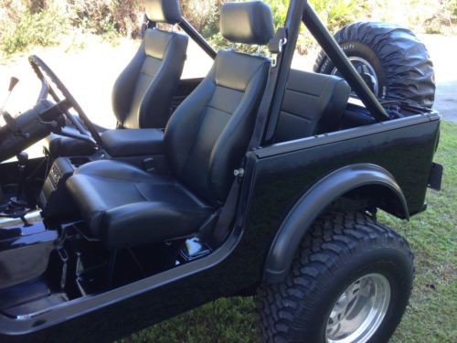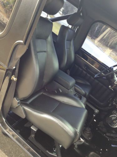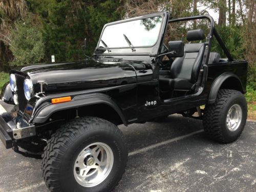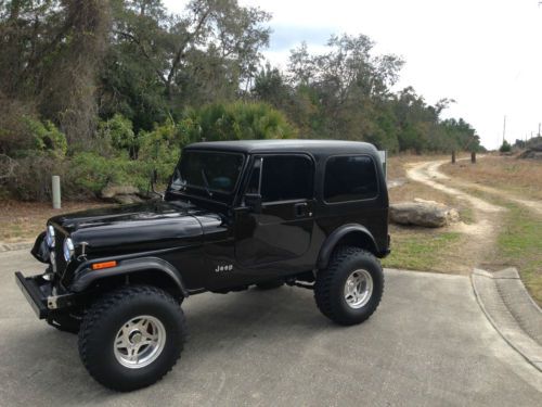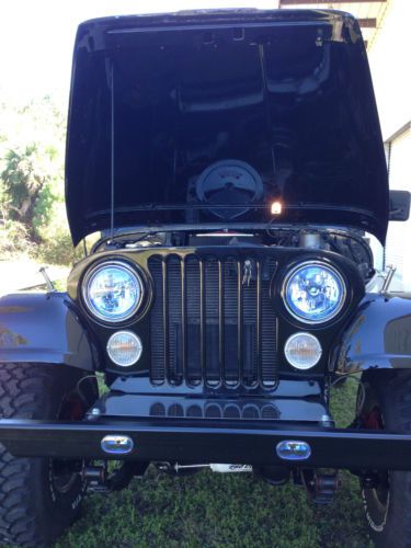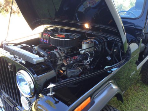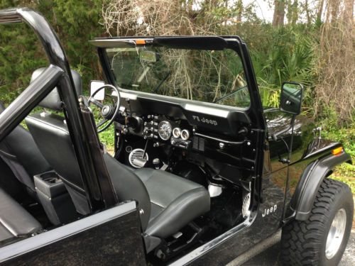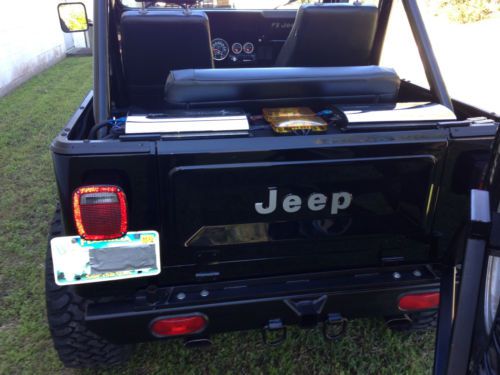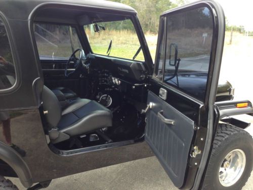 Selling our 1984 jeep CJ7 , was a california built custom frame off restoration .black on black on black .Has a low mile 350 conversion with automatic still on the column. Show quality - long distance highway /interstate drivable.Lots of upgrades including turn key fuel injection /4;10 matching gears /1 piece axles/upgraded hubs/6" lift total /33" tires 95% mathcing rim on spare with vinyl cover / 4 wheel power disc brake conversion /polk audio twin amp stereo system with 8 speaker surround sound that is incredible /headers with full length dual exaust out the rear/ custom bumpers with integrated fog and brake lights / sport comp gauges /upgraded cooling system / rear view mirror with 2 courtesy lights/Upgraded seats are just like brand new - Rear fold /tumble and both front seats recline on adjustable slide tracks / complete black softop with tinted windows like new /bikini top/ full hard doors and hard top that is painted dark grey inside not your typical ghost white from factory (all with matching keys) ,The interior floors,dash and engine compartment are all hi-gloss (mirror finish) paint matching black as well as the firewall and underside of the hood all match .The engine compartment is just as clean as the exterior and has a key operated hood lock in the grill.The jeep handles excellent,absolutely flawless around town or on the open highway.It has no play or sway in the steering what so ever - none . It's very quick off the line with 4:10 gearing but also has a lot of high end torque for interstate driving and with four wheel disc brakes it stops on a dime and I mean on a dime .This Jeep is not a battle to drive ,its a calming pleasure and you can be confident your spouse , guests or even kids can jump in it and go anywhere near or far without a single worry and that I promise ...This is a "very classy" moderatly upgraded 30 year old icon that rides and drives as well as it looks ......(photos are all current looks exactly as you see it )