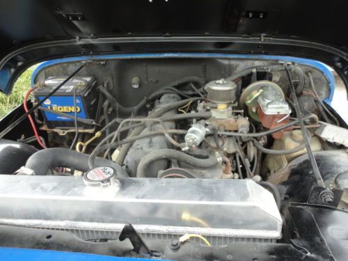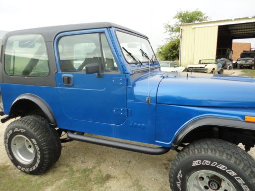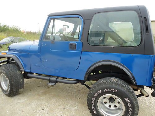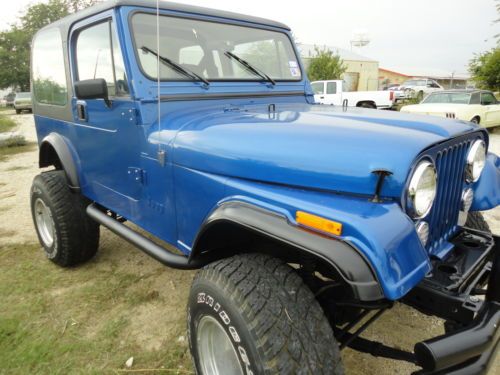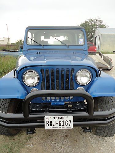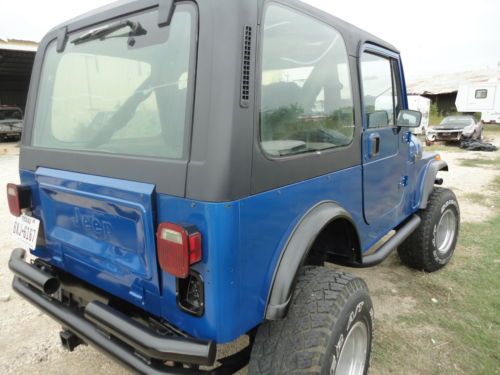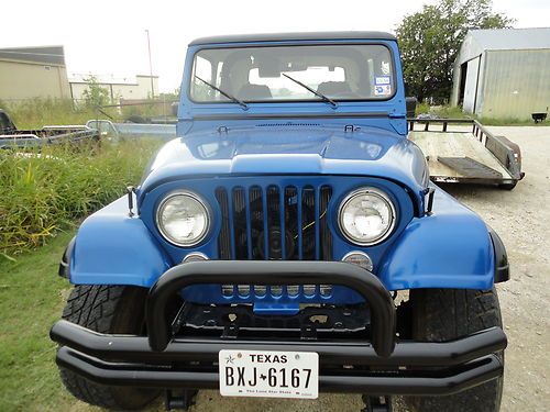 1985 CJ7 Jeep. Nice Southern RUST FREE Jeep! 6-Cyl, Automatic, PS,Power Disc Brake's, Factory Tack, 2 inch lift with 33 inch tire's, Aluminum Wheel's, Hard top & Hard top door's, Has Stereo & Speaker's but, Not hooked up. New Part's: Aluminum Radiator, Electric Fan's, Transmission, Master Cyl, Power booster, Carb, Windshield wipe switch, New lift and New paint!! ( Paint job is nice & shinny.) Interior is Blue & Black, Exterior is also Blue & Black. Please see picture's..Good Clean/Clear Texas Title. Frame is Good & Solid!! Shall you have any question's, Please feel free in calling Steve @ 940.465.5044 OR by email. Thank You and Good Luck!!!! |