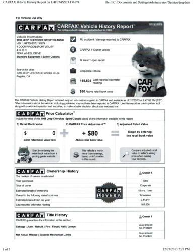 !! 3 DAY NO RESERVE AUCTION!! PLEASE PLEASE ONLY SERIOUS BIDDERS NO FLAKES!!! 0 FEEDBACK AND NEGATIVE FEEDBACK BIDS WILL BE CANCELED UNLESS THEY CONTACT ME 1ST AT 323-509-9039 Up for auction is a 1 owner (look at carfax pic attached) very sought after 1996 jeep Cherokee Sport/Classic rwd with 168k miles and roof rack!! *** 1 owner sport/classic white color in "fair condition" *** Only 168K ORIGINAL 1 Owner MILES - CLEAR, CLEAN TITLE *** Roof-Rack *** NEW BATTERY *** NEW COOLANT FLUSH AND OIL CHANGE This is a 1 owner Jeep Cherokee Sport/Classic 4.0 Liter 6 cyl RWD, its white in color - its in "fair condition" has some dents (front bumper...), scratches, scuffs (look at pics)... nothing too major and is in decent fair shape especially for a 18yr old car The jeep has a roof rack! The interior is gray cloth and is in "fair condition" has some minor wear and tear nothing too major and is in fair shape especially considering its 18yrs old! This is the very sought after 1996 White Jeep Cherokee Sport/Classic edition!! The jeep has good ac/heater spare tire in trunk (trunk does not stay open i put a stick to hold it open) Has after-market Boss Am/Fm radio, with CD, mp3, usb outlet, with remote... The engine and transmission are good! The tires are balding and will need replacement soon I BOUGHT THIS CAR FROM THE LOCAL IMPOUND AUCTION IN LOS ANGELES CA, ( IT IS A 1 OWNER CLEAR TITLE WHEN YOU GO REGISTER IT HAVE PAPERS FROM AUCTION TO GET TILE AND REGISTRATION), I DID NOT REGISTER OR TITLE IT TO MY NAME, SO THERE ARE NO TAGS, PLATES, REGISTRATION OR SMOG... *** ANY DMV FEES, REGISTRATION FEES, TAXES AND ANY OTHER FEES ARE RESPONSIBILITY OF BUYER *** THE VIN # ALONG WITH PHOTO OF CARFAX (ATTACHED ON PICS) IS PROVIDED ON THE LISTING. $200 DEPOSIT DUE WITHIN 24HRS REMEMBER THIS IS A 18YR OLD VEHICLE SO IT IS IN NO WAY PERFECT YOU CAN CALL ME TO INSPECT THE CAR ( I AM LOCATED IN CENTRAL LOS ANGELES) AT 323-509-9039 THIS VEHICLE IS USED AND IS BEING SOLD AS-IS WHERE-IS WITH NO WARRANTY!! |