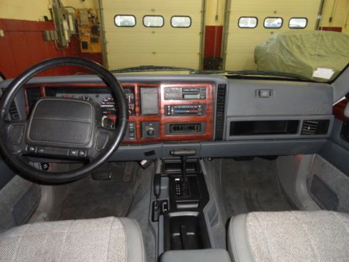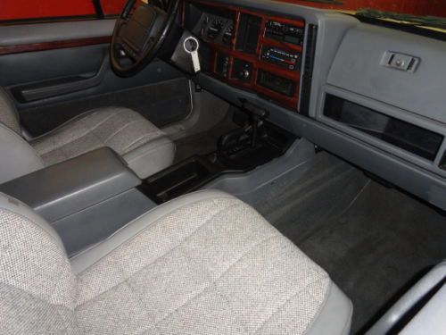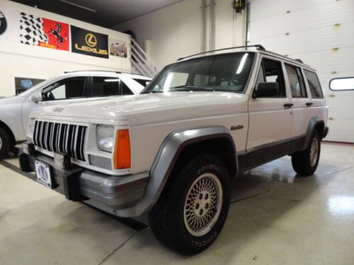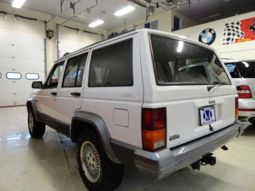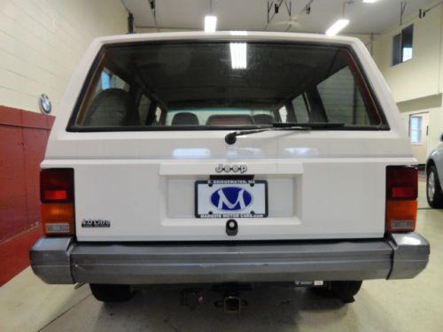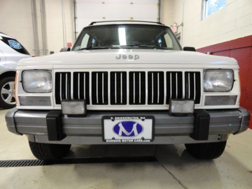 We just traded this great carfax certified Jeep Cherokee Country for a new LandRover.This vehicle has only 97k miles.The exterior is white and is in very good condition ,a few minor dings and scratches as you would expect on a vehicle of this vintage.The interior is Gray cloth and is in excellent conditon.The previous owner was not a smoker or had pets.This Cherokee has many options including power windows and locks,A/C,premium sound,roofracks,tow pkg.fog lights and premium sport wheels just to name a few,and the best engine Jeep ever made straight 6 cyl.This Jeep was just serviced and runs great.The previous owner never missed an oil change or a service.There is no rust underneath and has always been garaged.This Jeep is a true survivor with very very low miles.Its priced to sell so hurry it won't last.As always we welcome any inspection prior to purchase.If you have any questions or concerns don't hesitate to contact me at 1-781-910-6098 This vehicle is being sold with NO RESERVE so its going to the highest bidder.Hopefully a good home.Thanks and Good Luck!!! Phil |