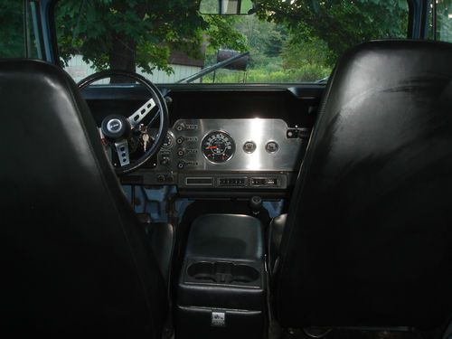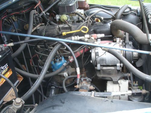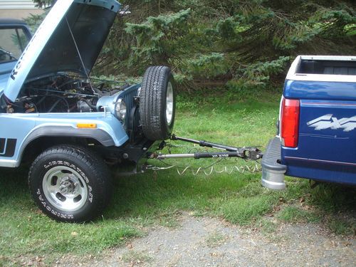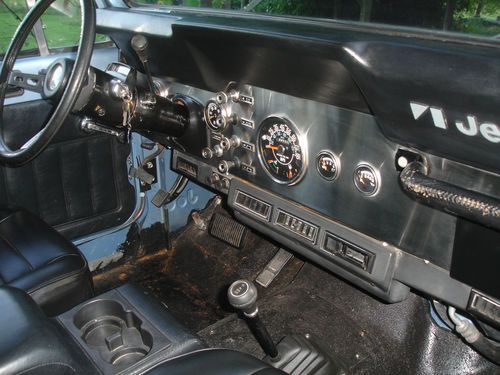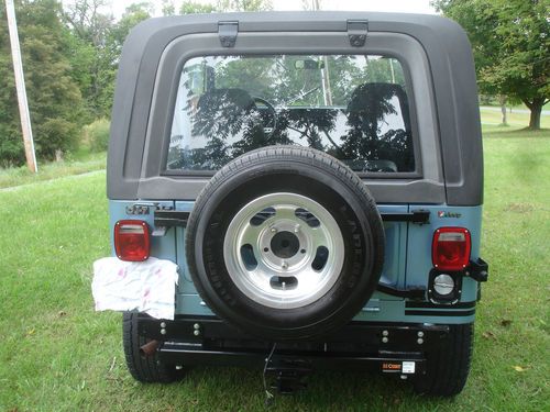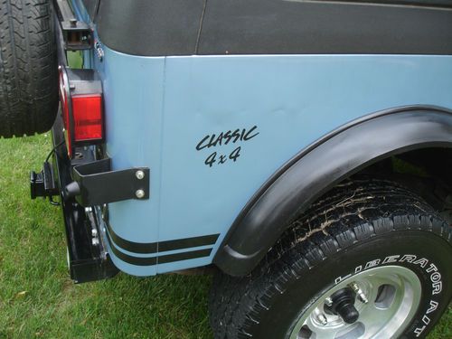 New paint, original color. Automatic 4.2 liter with 68,000 original miles. Cold air conditioning. Floor has had some metal welded in, seams sealed with POR 15 seam sealer. Under carriage outside of the frame painted with POR 15 rust preventative. Floor inside painted with rust preventative. Seats recovered. Stainless dash with tach and clock, all original gauges that work. Tilt wheel with sport steering wheel. Will send other pictures. I built this for my daughter who lives in an urban area and she has no inside place to keep it. I changed it into a pull behind for an RV vehicle - no lock in steering wheel - but my wife won't ride in one without an air bag. I have the blue ox hitch to go with it. You win the bid, you can have the blue ox if you want it. Wired to plug into towing vehicle 4 plug receptacle and all lights but headlights work on the jeep. Can be towed with all four wheels on the ground behind a truck. Has reese hitch installed. Adapter on front for jeep spare allowing for carry all in Reese hitch. Nice back seat, console, hard top and hard doors that fit well. Would make a great pull behind second vehicle for hunting in the west. I just don't need it, building a scrambler.