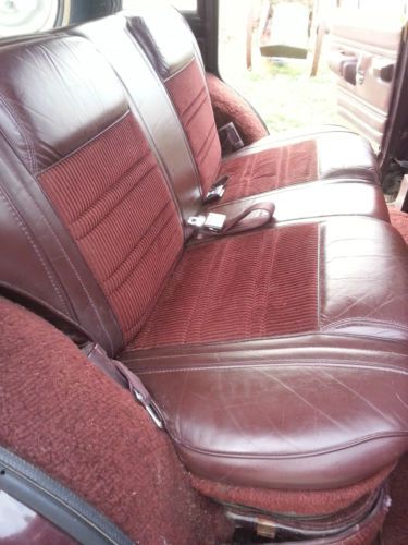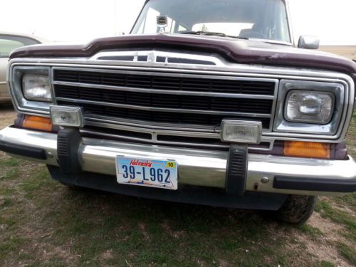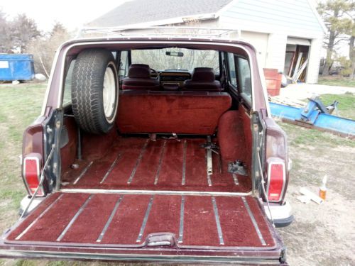 This is a 1987 Jeep Grand Wagoneer. 4x4 There are only three owners with this vehicle. No accidents and clear title. It runs great. Has power lock, power window. Newly rebuilt carb, plugs, wires. Color on original purchasing agreement says color is Grenadine. Trim is Cordovan. It was sold in Cheyenne, Wyoming in 1987 for 26,118.50 I have the original sales receipt as well as the original owners manual and Chilton manual. All new tires, new steering gear box, front end alignment. Interior is plush, beautiful and clean. Seats are perfect leather. Exterior has some UV on left side and hood and right passenger rear quarter panel has some rust and a dent. I am keeping starting bid low knowing transport can be expensive and SUV damage will need attention. In has been in covered storage since 2010 but started right up and ran. We have not added a sway bar as some people prefer not to have one. Buyer arranges all shipping and pays all transport cost as is where is.
