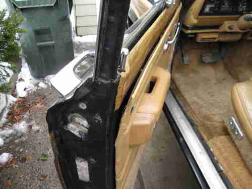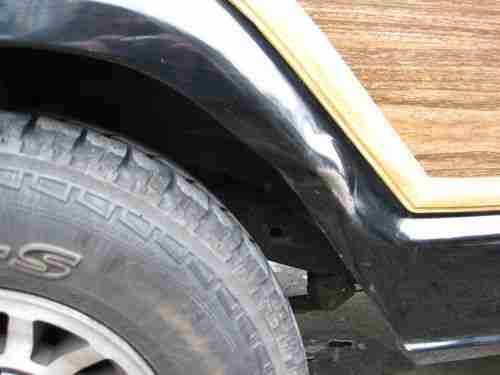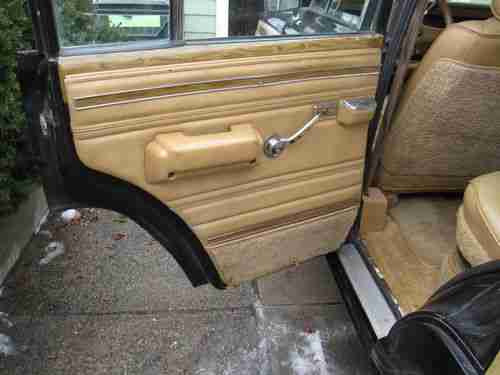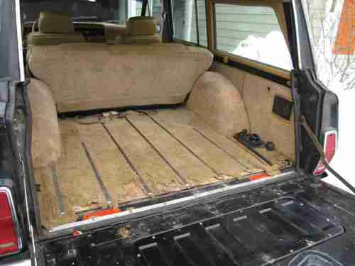I have owned this classic woody since July 2012, having bought it as a Summer project. The previous owner drove the vehicle until 2005 and parked it in her back yard. To my knowledge, I'm the third owner. All original, 168k, AMC 360, TorqueCommand 727 Automatic Transmission, Selec-Trac (229) 4WD, 'Classic Black' on Tan interior. Healthy number of new parts installed since July 2012. Solid frame (see chassis photos) -- originally a West coast vehicle. Starts and runs strong on the coldest of mornings and shifts smoothly. Very stock vehicle, with two exceptions. The original radio was replaced with an aftermarket CD/MP3 unit and the air pump and air injection tubes have been removed from the engine and the exhaust manifold ports plugged. This Wagoneer has typical wear associated with a 25 y/o Jeep one would expect; a few dents and paint chips etc., which I've tried to capture in the photos. Floor pans are mostly good and have a few small dime-size patches. The front driver and passenger side pans have been treated with POR15. Overall, I'd label the body and interior both as 'fair'. Not a show Jeep, but could be with light body work/paint and interior refresh. Looking to sell so I can move on to another project and free garage space. Currently registered and inspected in RI until November 2014. FSJs are classic vehicles that turn heads wherever they go. I've even found the occassional complimentary note on the windshield from time to time. The vehicle will be sold with a copy of the current RI registration (RI doesn't title vehicles older than 10 yrs.) and a notarized Bill of Sale. I welcome all questions and will post replies in the listing for all bidders to see. Vehicle is also for sale locally; auction will end early if local buyer is found. Here is a list of work that's been performed and work that she could use. Most of the ignition parts were replaced pre-emptively, simply to add reliability. Jeep was not known for strong electrical systems, so I elected to add some peace of mind to the driving experience. Photos of the problem areas to give prospective buyers a true sense of condition. The Good: -Dropped & Cleaned Fuel Tank -New Fuel Pickup & Sender -Re-built original Motorcraft 2BBL Carburetor -New hand-bent steel and rubber brake lines, Calipers, and Brake Pads (only brake lines not replaced were hard lines between master cylinder and proportioning valve) -New Master Cylinder -New Distributor, Distributor Cap, Rotor, and Plug Wires -New Ignition Module -New Ignition Coil -New Starter Solenoid -New transmission selector shaft seal -New transmission filter and fluid -Power Windows all raise/lower with either the driver master switch OR individual door switch -Treated floor-pan rust with POR15 (pans are still very solid, with two small dime-size holes that were patched with fiberglass filler) -Tailgate Window raises and lowers reliably from the tailgate key-switch and intermittently from dash switch* -New transmission output and transfer case input seals (Jan '13) -4WD engages properly -Tire Balance and Front-End Alignment -Fresh Battery -New Headliner Fabric The Bad: -Oil weep from crank seal and oil drain plug -Coolant weep from radiator drain fitting -Transmission fluid weep (unsure of source -- possibly pan gasket) -Slight exhaust leak near down-tube/heat-riser -Right rear axle seal weep -Engine Wire Harness and Dash Harness had sections of burned wire when I bought the Wagoneer last July. I spliced in sections of new wire where needed to make the electrics functional. Original harness can be found on Ebay for $50-100. -Needs new vent windows ($75-100/ea at junk yard or Ebay) -Needs carpet sill plates -Leaf spring bushings to improve road manners -Passenger rocker needs a patch under the rear door, roughly 4" across -Driver and passenger quarter panels need minor spot repair -Rear Defroster inop (Solder let go at tailgate window. I have the wire harness, which can be re-soldered) -Needs new door jamb switches to activate dome lights upon entry/exit (both dome/cargo lights work manually at the overhead switches)