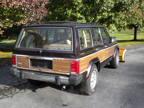 I am the second owner of this Jeep. Although it is called a Wagoneer. This Jeep is the newer smaller body like the cherokee. In 1990 this was the top of the line Cherokee which they called a Wagoneer. It is fully loaded including full power and power leather seats. When I bought it about 14 years ago the milage was around 78,000. I have put less then 8,000 miles on it in 14 years. I installed a Meyers 6.5' snow plow on it and used it to plow my business parking lot and a few other of my own properties. It is great for plowing driveways and parking lots as it has a very tight turning radius. About 3 years ago I bought another vehicle with a plow and no longer need this one. The plow is in good condition and still works good. The Jeep has been sitting for more then 3 years and needs work. I have started it to move it many times during the 3 years so the engine is still good. I believe the engine, trans and rears are fine, it starts up runs and drives but sitting for 3 years has taken its toll. The drivers door is starting to rust at the bottom and the headliner material is coming down but the tires are all good. I am selling this Jeep as is where is with no warranties expressed or implied. It is not inspected and has not been inspected in at least 3 years. You may be able to drive it but I strongly advise having it towed to a mechanic and looked over before driving it on the road as I'm shore it will need work.