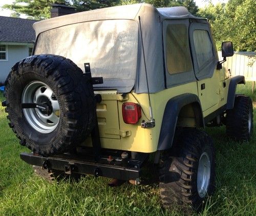 I have a 1991 Jeep Wrangler for sale. It has a 4" Skyjacker suspension lift with 1" shackles and a 3" body lift. The fenders have been trimmed and has TJ flares with working lights. Has SYE kit installed. Has 4.0 6 cylinder and 5 speed transmission. Running 4.56 gears in both axles with a lock right locker in the rear. Currently it has 35" Mickey Thompson Claws on it, but they are getting pretty worn. It currently has an old warn upright winch, model 5687. This winch is a predecessor to the 8274, but it only powers in and free spools out. In the pictures the cable is off of the winch, but I have the cable stored in the garage. Also has a heavy duty rear bumper with swing out tire carrier. It has rocker guards. The odometer has about 156,000 miles on it. The motor in it now was put in it at around 125,000 and came from a '95 Cherokee which had about 55,000 on it. The transmission was completely rebuilt and installed with a new clutch and has less than 30,000 miles on it. The front and rear axles were rebuilt and gone through when re-geared and have less than 30,000 miles on them. Has an AEM cold air intake. Has a cat back exhaust system.