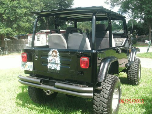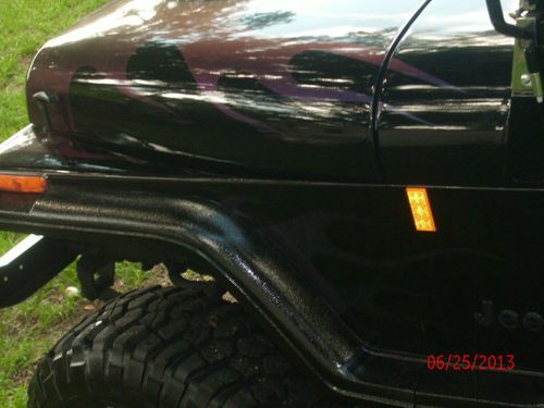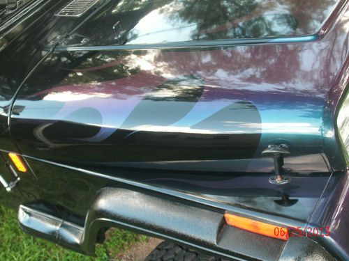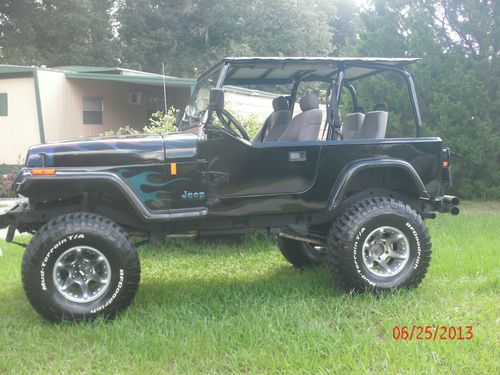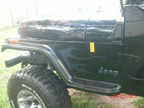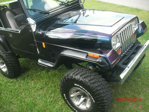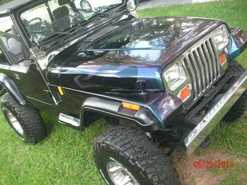 1992 Jeep Wrangler 4x4 paint with flames ,Pearl overlaps ,shows mid njght blue purple.copper.orange ,red ,green,over black.Jeep is very fast.258 6cyl.bored 60 over.with holley 4 barrel carb.Offenhouser manifold.456 gears,.lots of new parts.battery, carb,cap/rotor fuel pump.universal joints .4 speed manual trans. New front/rear brakes. Recent clutch kit. Tires like new 35/12.5,BF Goodrich.Heater core is not hooked up. to much to list. I bought this from a friend .He had this custom built for the mud.his health was not good.had to sell it.Much money invested in this ride.I have driven this for about 3 months .Looks great ,a real attention getter