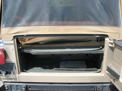 year. Recent mechanical work (last five years): 2009 - new muffler and catalytic converter 2010 - new AC compressor 2011 - new thermostat 2012 - new front brake pads and rotors, new rear wheel cylinders, brake shoes, and brake drums - new tires - new battery - new alternator - new idler pulley and serpentine belt 2013 - new distributor cap and ignition coil - new starter - new fuel injectors 2014 - new windshield wiper motor (intermittent does not work; normal and fast work) and linkage - new radiator It passed New Jersey inspection last year. Will include a Wolf cover, the original Sahara logo spare tire cover (good condition), some after-market Jeep logo fog lamps (never installed), and all mechanical records. $2500 BUY IT NOW! This is a one-time, 7-day listing. If it doesn't sell, I will sell it locally or part it out. Buyer will have to arrange for any and all transportation of the vehicle. Feel free to ask any questions. Thanks for checking out my auction and good luck! Very respectfully, Chris |