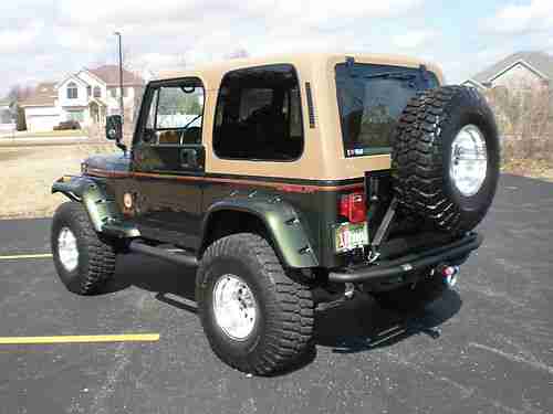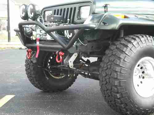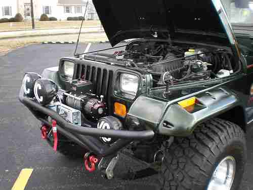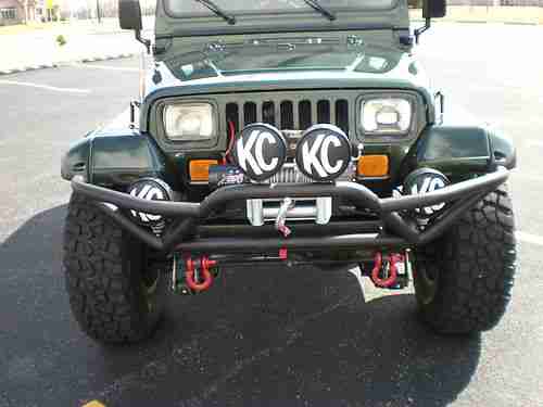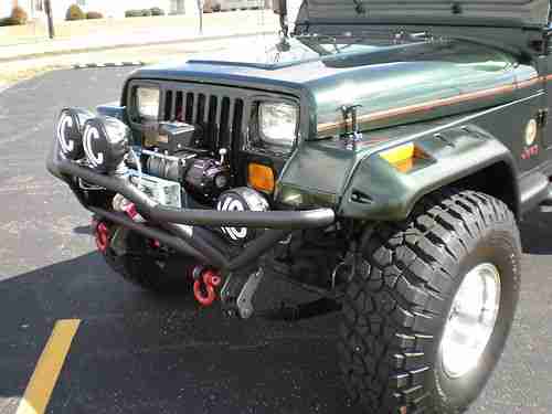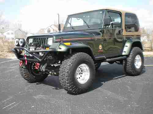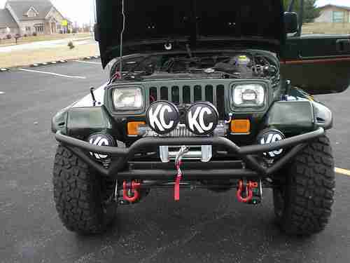 This is the nicest 1995 Jeep Wrangler Sahara that you will find anywhere.I purchased one year ago,and I am the 4th owner.Clear title in hand,no lien.All optional equipment listed next,is less than (2) years old:Smittybilt XRC8 8,000lb Winch(brand New..Smittybilt Nerf (3)in.Nerf Bars..New Tuffy Lock/Storage Box..5.5"Rubicon Express suspension lift and shocks..Rubicon Express steering stabilizer..Tom Woods custom CV Driveshaft/Slip yoke eliminator..35" BFG KO(less than 4,000miles)..American Outlaw Racing wheels 15x10/Full Size Spare..Smittybilt front/rear bumpers(all KC Hilites work professionally installed)..Kenwood HD Radio/Polk Audio in front,6 speaker soundbar,and Rockford Fosgate 12" subwoofers in rear w/Alpine MONO Amplifier..Smittybilt pocket style fender flares professionally painted and color matched..Metal Half Doors also professionall painted and matched..No Body Rust..New Smittybilt floor protectors F/R...D Rings brand new..No Accidents..This beautiful Sahara was purchased new by a professional San Jose Sharks hockey player,and the Jeep sat all winter in his garage.I have never had this Jeep off road,and it looks like it has not ever been off road.You will not find a better example of a Sahara Wrangler than this one.Please read my perfect feedback,I have bought and sold many vehicles without negative results.If you are just wasting time please play somewhere,I will cancel your bid if I suspect less than honorable intentions. Miles are original,Jeep is exceptional! No a/c.or..Cruise.