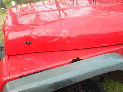 Decent or fair, previous owner may have mudded with it. Usual rust and dings, faded paint. Solid fiberglass hardtop (it's gray, I don't know why), full metal doors, all in working order. The passenger side door has a weak latch and will occasionally open itself, more often with the top off, hardly ever with the top on. Driverside front fender came from a junkyard. TJ fender flares. 2in body lift. Should accomodate 33in tires without rubbing.