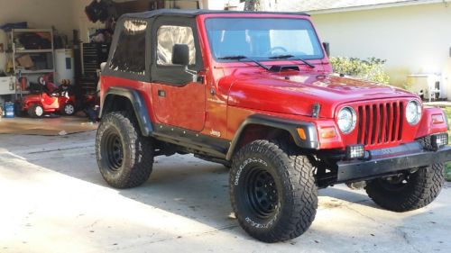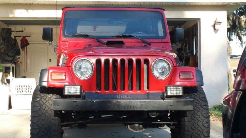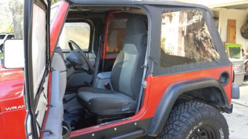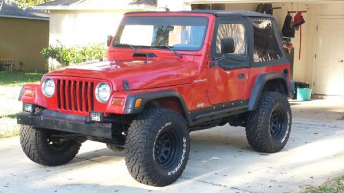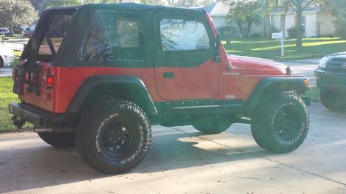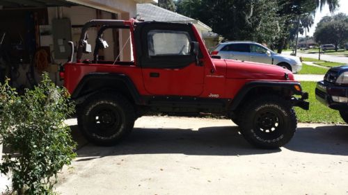 For Sale is a 1997 Jeep Wrangler 4cyl. 5-speed. It does NOT have ac. It has new Goodyear Wrangler mud tires. 33x12.5x15 on aftermarket steel wheels. It has a 4" lift kit and also has a SYE installed. The rear seal on the SYE is leaking but is a easy fix. The Jeep will also need new shocks including the steering stabilizer. It is a 97 and does have some of the typical rust. Top of drivers fender, and the bottom of the rollbar along with the floor at the base of the rollbar. I bought the Jeep about a month ago and gave myself a MAX budget as this was going to be a 3rd vehicle we really didnt need but I wanted. I looked for several months to find a good jeep in my budget but as anyone who has looked for Jeeps in Florida knows, they are pricey down here. This one was listed as needing a fuel pump, not a big deal in a jeep so I took the drive to go look at it. When I got there the guy started it up and it idle. Kind of through me off because if the pump was bad it shouldnt run, right??? So I figured this guy just wasnt mechanically inclined and I bought it. More then I wanted to spend, but I bought it anyway. Towed it home and went shopping. I knew it needed a top so I bought a Rampage soft top, sliders, and the parts for a tune-up. The next day I started working on the jeep and found several other problems. Leaking afterkmarket oil gauge, rusted rollbar, bad radiator, among other things. So I started replacing parts. After the tune-up it still would not run smooth so i checked the pump...bad. Ordered the complete pump assembly ( pump. both filters, sending unit, and pressure unit) and after installing it ran much better but not smooth still. Did some more digging and found the pressure sending unit on the power steering was bad so I bought a new one and installed. Now it runs good. The rust on the rollbar and the floor has been treated with TOTAL SOLUTIONS RUST CONVERTER several times and then sealed with body filler. Then the interior was coated with bedliner. If I was going to keep it i would replace the rollbar just for safety. At this point I have COMPLETELY blown my budget and need to sell the Jeep to keep from getting a divorce. Like I said it does need a few things but it is a good Jeep. Here is what i have done....