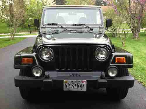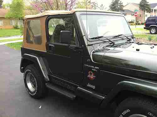 Priced to sell. 1998 Sahara 4.0 Liter 6 cyl with Manual 5 speed tranny. Needs nothing. No accidents, clean autocheck. Comes with hard top and soft top, COLD AC, rear seat, fog lights, tow hooks, Kenwood AM FM CD Mp3 player, also have original radio, Super clean underneath, never abused or off-roaded, this is my daily driver. Mechanically sound - everything works. Only reason for selling is need a bigger vehicle. Paint is shiny and good condition overall- not perfect but good driver quality with its share of wear. See pics. Only dent is in rear tail section above headlight. See pic. Runs and drives excellent, adult driven daily. You will be hard pressed to find one this nice this original and not abused. It has the original soft top that I still use - has had some sewing done on it but its dry and original and does great. Bid with confidence, vehicle is listed for sale locally and I reserve the right to end the auction early.