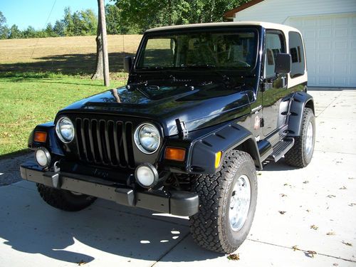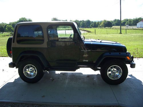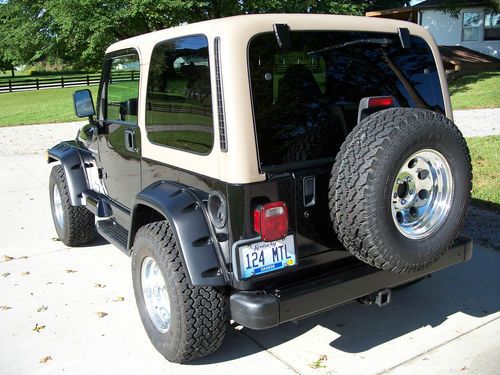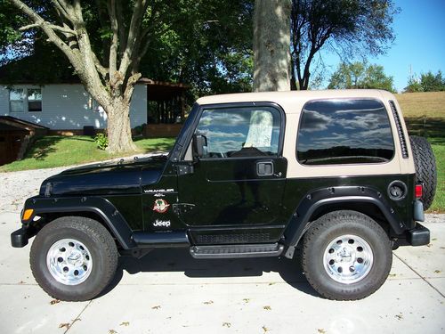 This is a nice Jeep that I use daily. It is a 5-speed stick with a 4.0L, 6 cylinder engine. It has power steering, power brakes, air conditioner/heater, HARD TOP, cruise control, tilt steering, heavy duty tow hitch (I have never towed anything) and an AM/FM CD. The radio has a lot of static, but the CD player works great. It drives great and everything works. I bought this one year ago and have repaired/replaced the following: 2 O2 sensors, oil pressure sending unit, new brakes, plugs, wires, cap, rotor, filters, radiator, air cond compressor/dryer, air/heat control panel in dash, battery, all hoses and belts. Then, I spent about $2000 for 5 Mickey Thompson wheels, 5 General LT26570R15 Grabber AT2 tires and fender flares. The tires have about 2000 miles and I have not taken this off road. I spent all the time and money fixing this up for the next guy cuz I want to move onto something bigger! This jeep is sold AS-IS with no warranty implied. Buyer is responsible for all expenses related to pick-up/transportation from my location. Questions? Call 606-282-8067.This vehicle is also listed locally for sale. I reserve the right to remove this from Ebay at any time.