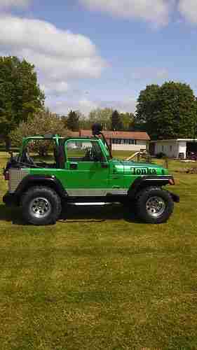 THE JEEP HAS A NY STATE TITLE BUT A SALVAGE TITLE MAKED REBUILT SALVAGE PA. WE PUT THIS JEEP TOGETHER HAD THE FRAME STRAIGHTENED ABOUT 10 YEARS AGO. IT HAS BEEN A AWESOME JEEP. EXTERIOR IS IN NICE SHAPE THE PAINT HAS A NICE SHINE. THE ORIGINAL COLOR WAS GOLD. THE TONKA IS A DECAL HAS SOME WEAR. THER ARE SOME SPOTS WITH PAINT CHIPS ONE SCRATCH ON THE HOOD AND A SMALL DENT IN THE WINDSHIELD FRAME. THIS IS A GREAT JEEP BUT NOT PERFECT DONT EXPECT A SHINY NEW ONE . THE FLOORS HAVE BEEN RINO LINED YEARS AGO IN NICE SHAPE. TOUCH OF RUST ONE A FENDER. SEE PIC. MOSTLY RUST FREE SMALL SPOTS NOTHING MAJOR.NO CARPET. LIGHT BAR NEVER HOOKED IT UP MORE FOR LOOKS.