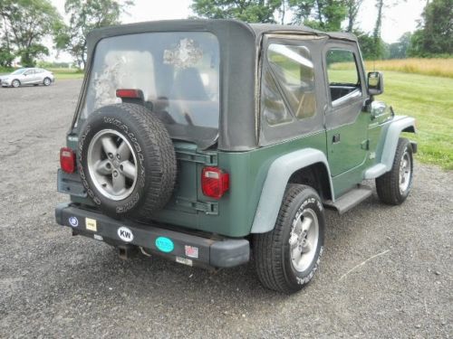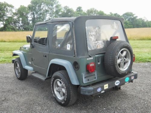1999 Jeep Wrangler (TJ) SE Soft Top Great Condition Has Power Steering Factory Air Conditioning 4 Wheel Drive Tires have a little better than 50% wear left maybe more AM/FM CD Player Everything works as it should Low Miles for model year ONLY 82,000 Took a lot of pictures to show as much detail as possible Frame has surface rust, I didn't see where it was through the Frame anywhere including the body The Soft Top is the original Top and is showing signs of wear, I would probably replace it The tops can be found here on eBay for about $239 - $250 This is a Jeep you buy and drive, you don't have to do anything to it. The Hood has some minor hail damage, it is not to noticeable in the pictures Jeep is being sold in AS-IS Condition I answer questions as soon as I receive them Click any picture for a larger view or copy and paste this link into your browser: http://1999greenjeep.blogspot.com Any Questions Please ask before bidding. A $500.00 Deposit is required within 24 hours of auctions end time. Payment in full is due within 5 days. $500.00 Deposit due within 24 hours of auction end time. Balance Due within 5 Days of Auction end time. If you cannot afford it please do not BID. Thank you for looking.