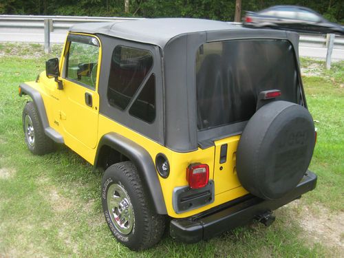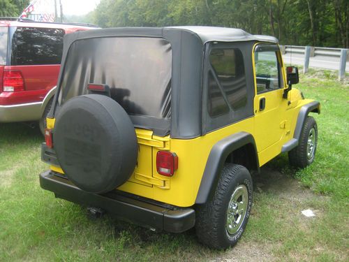 This is a nice 2000 Jeep Wrangler, equiped with the 2.5L 4cyl, 5 spd trans, cold A/C, cruise, tilt, am/fm cd, full metal doors, tow hitch, tinted windows in top. Overall good cond, tires are in good cond, top is nice with no rips or tears, there is a dent in the left rear panel shown in pics, and a tear in the drivers seat.
