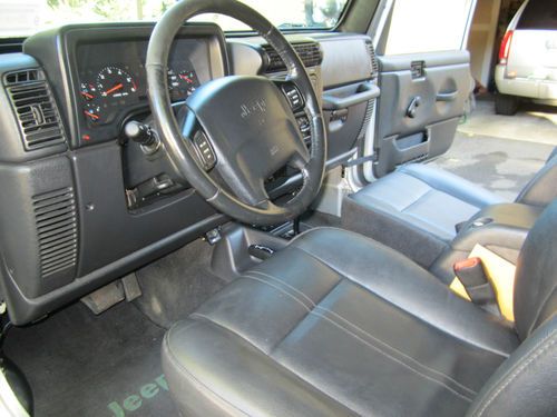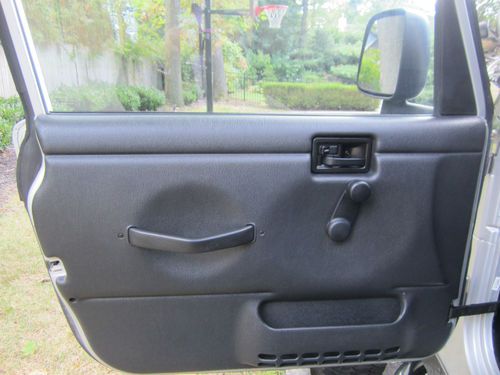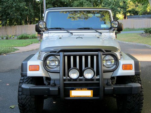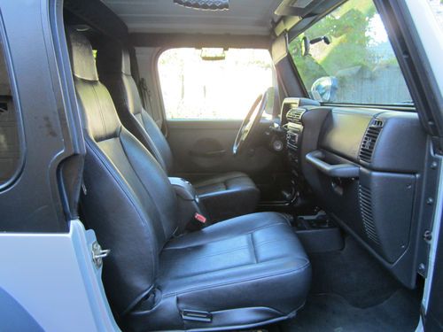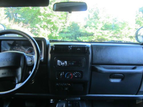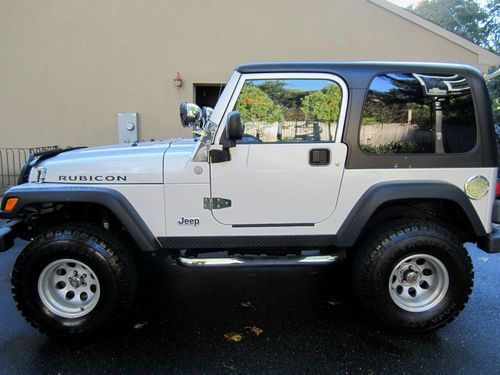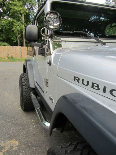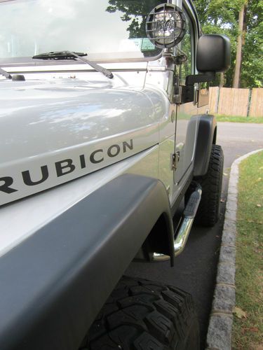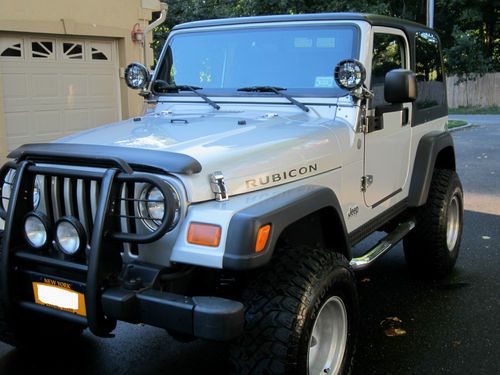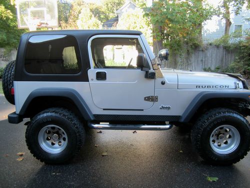 Pictures speak for themselves. This is a super clean 2004 Jeep Wrangler Rubicon from a non-smoking and pet free home. Hard to find a used Wrangler with leather seats, even harder to find a used Rubicon - and believe me it makes a difference. The car simply sparkles and looks incredible with or without the hard/soft top. The car comes with a hard top, soft top, push bar, KC lights an after-market radio/cd player with a subwoofer (have the original radio too), Mickey Thompson off-road tires, skyjacker lift, step bars, chrome accents on the gas-cap, door hinges, hood clamps and hood hinges. I also have a front/hood mask that I have never put on the car, and I'll toss that in too. No body damage. Obviously it's not a brand new car but the only really noticeable scratches are the few on the hardtop (see driver side and rear photos - scratches can be easily touched-up which I plan on doing) - other than that, body is in excellent shape. Car was inspected this summer and mechanically it's sound. A/C works, Heat works. I'd say the only thing it could use is a wheel alignment (but really no need to do that until the next tire change) and, depending on ride preference, some softer/new shocks. The car has just under 98k miles but I'm still driving it so mileage may be higher than the 99k I listed above. Take a look at Kelley's Blue Book -- my buy-it-now price is below value.