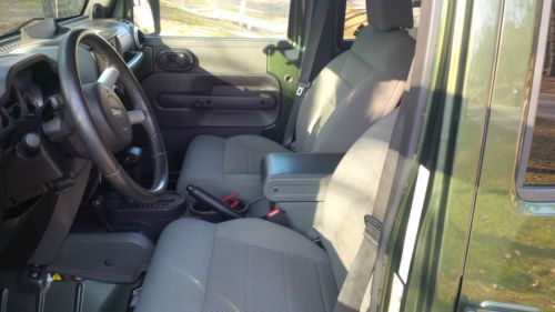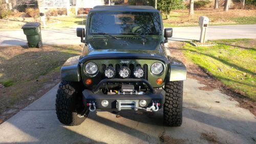2008 Jeep Wrangler four door 4WD automatic for sale. It is forest green in color with a soft top and 62,092 miles. The Jeep has Skyjacker shocks, 2.5" lift kit, 35" BF Goodrich Mud Terrain tires in great condition, and a 9,000 pound winch on the front with Rough Country front bumper and three KC lights. Original Jeep rims have been powder coated black except for the spare rim. It has an Infinity stereo system with a subwoofer and it has navigation. Power windows and door locks. I currently have the carpet out of it, but can put it back in for the buyer. The carpet itself is in good condition. The Jeep also has an extended warranty until 106,219 miles on it which includes 4WD and electronic coverage. Oil has been recently changed on the Jeep and it had the transmission fluids changed along with transfer case in the past 250 miles.