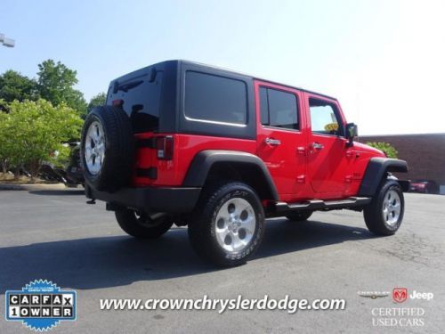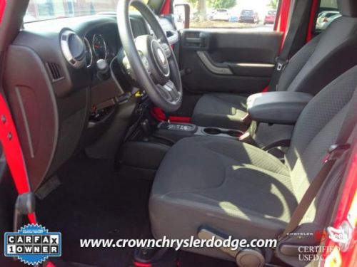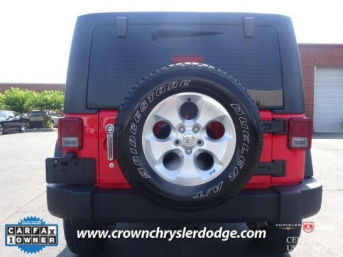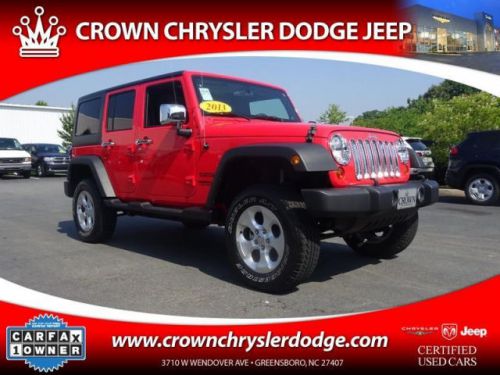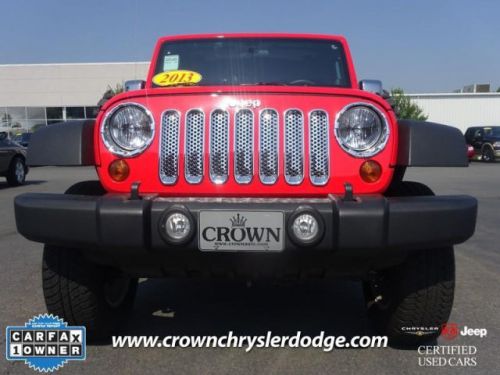 This outstanding example of a 2013 Jeep Wrangler Unlimited Sport is offered by Crown Chrysler Dodge Greensboro. This beautiful Red/red Wrangler Unlimited Sport qualifies for the CARFAX BuyBack Guarantee. Just say Show me the CARFAX and Crown Chrysler Dodge Greensboro will provide the history report for free! This Jeep Wrangler Unlimited Sport is an incredibly versatile vehicle that is a must have for any family. This 4WD-equipped Jeep will handle majestically on any terrain and in any weather condition your may find yourself in. The benefits of driving an Four Wheel Drive vehicle, such as this Wrangler Unlimited Sport, include superior acceleration, improved steering, and increased traction and stability. More information about the 2013 Jeep Wrangler Unlimited: With prices starting at a little over $20,000 with standard 4-wheel drive, the classic Wrangler is one of the best SUV values available. The 6-speed manual transmission helps the Wrangler achieve a not-too-shabby 15 mpg city and 19 mpg highway rating. Jeep considers the Wrangler's off-road prowess integral to the brand, and they continue to make one of the most capable 4-wheel drive vehicles out there. The Wrangler is one of the most capable off-road vehicles sold today, with its inexpensive price being the icing on the cake. Interesting features of this model are impressive off-road prowess, Iconic styling, and two and 4-door configurations available Please print this add and ask for our Internet Sales Dept. to receive your special Internet discount of $250. Price plus tax, tag, and dealer administrative fees on approved credit only. While every effort has been made to ensure display of accurate data, this listing may not reflect all accurate vehicle items. All inventory listed is subject to prior sale. Photo shown may be an example only.