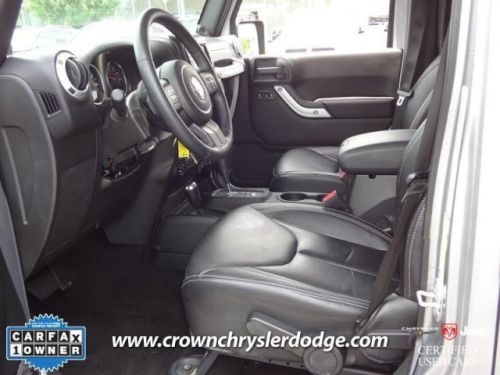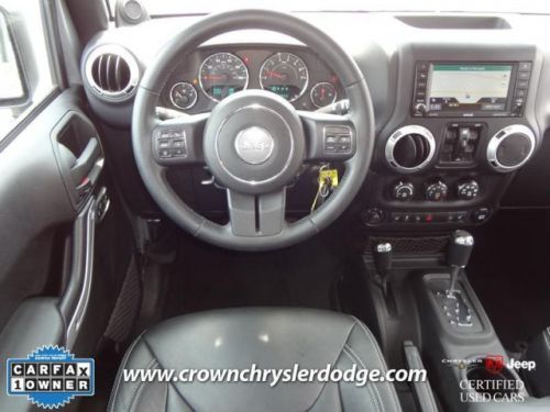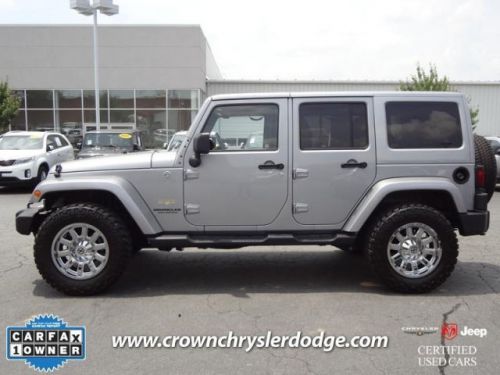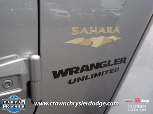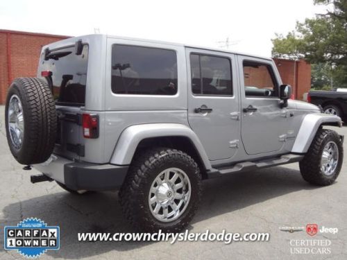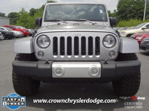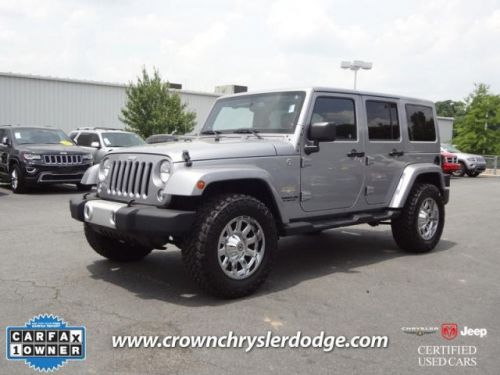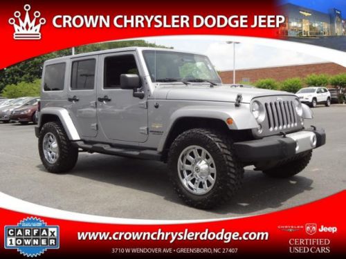 This 2014 Jeep Wrangler Unlimited Sahara is offered to you for sale by Crown Chrysler Dodge Greensboro. Rest assured when you purchase a vehicle with the CARFAX Buyback Guarantee, you're getting what you paid for. In their original incarnation, SUVs were chiefly owned by folks who valued utility above sport. Not anymore! The Jeep Wrangler Unlimited Sahara redefines the SUV and makes the perfect all around family companion. This 4WD-equipped Jeep will handle beautifully on any terrain and in any weather condition your may find yourself in. The benefits of driving a 4 wheel drive vehicle, such as this Wrangler Unlimited Sahara, include superior acceleration, improved steering, and increased traction and stability. More information about the 2014 Jeep Wrangler Unlimited: With prices starting at a little over $22,000 with standard 4-wheel drive, the classic Wrangler is one of the best SUV values available. The 6-speed manual transmission helps the Wrangler achieve a decent 17 mpg city and 21 mpg highway rating. Jeep considers the Wrangler's off-road prowess integral to the brand and they continue to make one of the most capable 4-wheel drive vehicles available. This model sets itself apart with Iconic styling, impressive off-road prowess, and 2- and 4-door configurations available Please print this add and ask for our Internet Sales Dept. to receive your special Internet discount of $250. Price plus tax, tag, and dealer administrative fees on approved credit only. While every effort has been made to ensure display of accurate data, this listing may not reflect all accurate vehicle items. All inventory listed is subject to prior sale. Photo shown may be an example only.