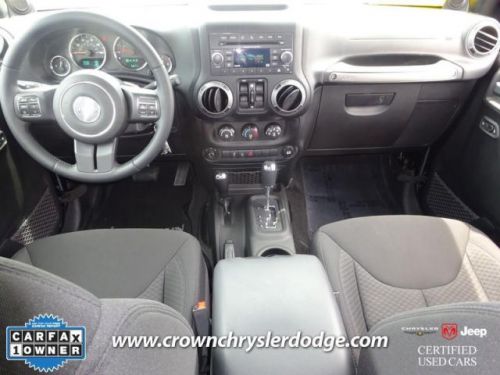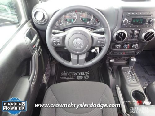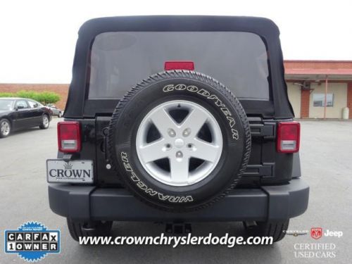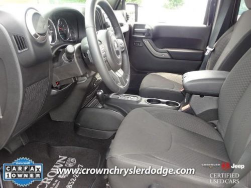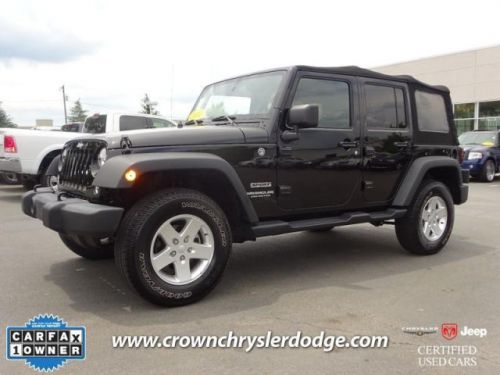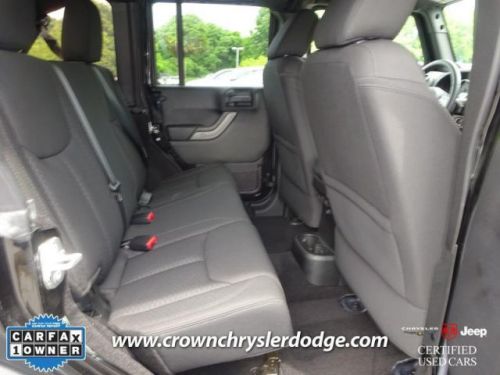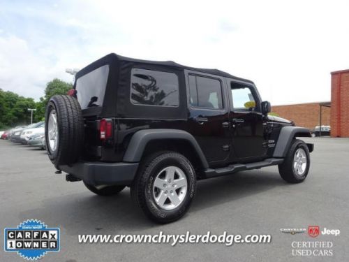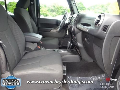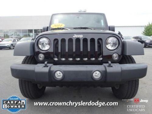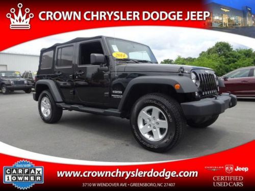 Crown Chrysler Dodge Greensboro is pleased to be currently offering this 2014 Jeep Wrangler Unlimited Sport with 5,465 miles. Only the CARFAX Buyback Guarantee can offer you the built-in peace of mind of knowing you made the right purchase. The Jeep Wrangler Unlimited Sport offers a fair amount of utility thanks to its advanced features and unique styling. It's also quite sporty, and injects an ample amount of handling chutzpah into the ridin'-high body of a family-friendly SUV. This 4WD-equipped Jeep handles any condition on- or off-road with the sure footedness of a mountain goat. With unequaled traction and stability, you'll drive with confidence in any weather with this Blk/black 2014 4WD Wrangler Unlimited Sport. More information about the 2014 Jeep Wrangler Unlimited: With prices starting at a little over $22,000 with standard 4-wheel drive, the classic Wrangler is one of the best SUV values available. The 6-speed manual transmission helps the Wrangler achieve a decent 17 mpg city and 21 mpg highway rating. Jeep considers the Wrangler's off-road prowess integral to the brand and they continue to make one of the most capable 4-wheel drive vehicles available. Interesting features of this model are Iconic styling, impressive off-road prowess, and 2- and 4-door configurations available Please print this add and ask for our Internet Sales Dept. to receive your special Internet discount of $250. Price plus tax, tag, and dealer administrative fees on approved credit only. While every effort has been made to ensure display of accurate data, this listing may not reflect all accurate vehicle items. All inventory listed is subject to prior sale. Photo shown may be an example only.