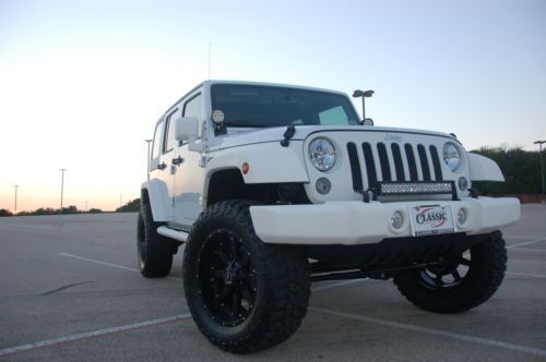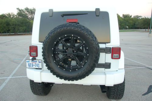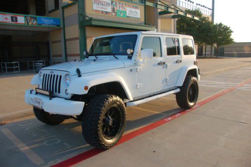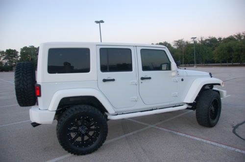 Up for sale is a highly customized all White Jeep Wrangler. It has the 24S package with UConnect, Bluetooth, 3.73 Axle Ratio as well as many other factory options. The bumpers, top, side bars and mirrors are all painted white kevlar. With the 4" suspension lift, black wheels and all other options, this vehicle is definitely a head turner. Be ready to get attention everywhere you go. I have been driving and people stop and point. It came out as one of the cleanest jeeps I have ever seen. My friend owns the shop, been in business over 30 years, that builds the jeeps and has been customizing cars for me for that long, my family was in new car business for 40 years, but sold out. He does all kinds of vehicles, for many athletes, but specializes in Jeeps. He has jeeps shipped to his shop from all over the country from dealers as well as individuals and I am helping him sell a few himself for fun. Buy with confidence knowing this customization has been built by a reputable shop, not another fly by night shop trying to get in the business. References can be provided and he will stand behind all work. WRANGLERS HAVE PROBABLY THE BEST RESALE OF ANY VEHICLE ON MARKET. The following is a list of the aftermarket adds: