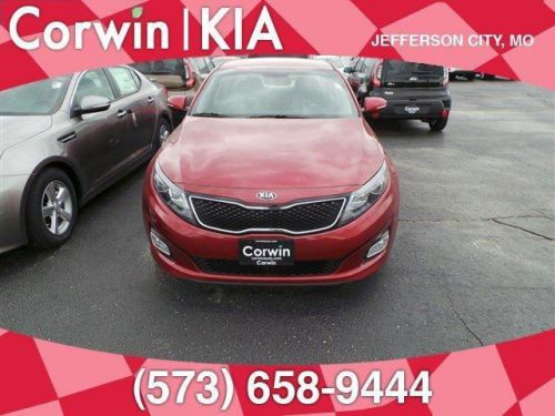 With world-class engineering, outstanding performance and advanced safety systems, the 2014 Kia Optima gives you good reason to be passionate about driving a midsize sedan. It combines bold exterior styling, performance and a spacious, luxurious cabin. Some key updates for the 2014 model include lightly redesigned front and rear, new seat design and more high-tech features. It also comes with a long list of technologically advanced features for your entertainment, convenience and safety. With the Optima, exhilaration is standard. The key to its exciting performance are the two available engines: the 2.4L Gasoline Direct Injection with an EPA rated 24 city/35 hwy mpg or the turbocharged 2.0L GDI I4 engine that delivers 274 horsepower and fuel efficiency of 22 city/34 hwy mpg. The Optima also has a standard 6-speed Sportmatic transmission for an engaging driving experience. The Optima Hybrid features a 2.4L Atkinson cycle 4-cyl. engine giving an amazing 35 city/40 hwy mpg. Spacious and comfortable seating can accommodate five adults and includes a driver's seat with power lumbar and available leather seat trim. Rear seats have a 60/40 split-folding design for added versatility. Optima EX/EX Turbo and SX Premium Packages include front and rear heated seats and heated front seatbacks for cold-weather comfort. The Optima is designed to make every drive a pleasure. The available Premium Touring Package includes features like the innovative UVO infotainment system which lets you use your compatible cell phone to make hands-free calls, receive and respond to text messages, listen to streaming audio, enjoy your personal music, and play your favorite song, artist or genre of music all by giving a single voice command, premium Infinity sound system for exceptional audio entertainment, and a panoramic sunroof. The available Technology Package includes a voice command navigation system, giving you access to detailed highway conditions from SiriusXM Traffic. Located in Jefferson City, MO we are your Mid Missouri KIA dealer with easy access from Columbia and Lake of the Ozarks. We have a terrific selection of vehicles that we sell the Corwin way: No pressure and full disclosure! Should your vehicle need service, we offer a shuttle service, free wireless internet and a child play area! Come see why we're different from the rest and get behind the wheel!
