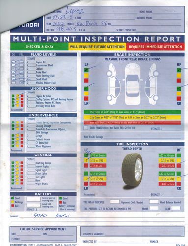 1 owner vehicle that has been well cared for. 90% of the miles are highway miles, as we are in Rural Texas, and mostly driven at 65mph b/c that is the highway speed at which we got the best mpg approx. 26/27. Car has received its major services at 30K and 60K through KIA dealership. I took it in for the 90K, but as I was selling it, I had the service center run through their multi-point inspection, and everything checked out well. Great car for moving families w/ young children. We sized up as our children our teens or becoming teens, but truthfully I think we could have been okay for a few more years, but I have to keep the wife happy. As long as the maintenance is kept up, I believe this vehicle will go for at least twice as long as it has to this point.