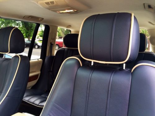 Gorgeous white with all tinted windows 2008 Range Rover HSE. The interior is one of a kind with navy blue leather seats with a white trim detail. All weather floor mats are included as well as a privacy screen for the back cargo area. The dash is navy blue leather with wood finish. This SUV has Navi, a back up camera, as well as blue tooth. It also has a sunroof/moonroof and heat and cooled front as well as rear seats. There is also a tow package installed.