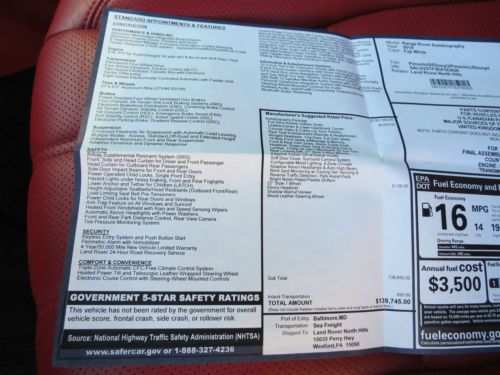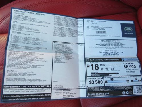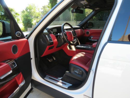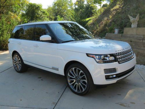 For sale is a 2014 Range Rover Land Rover Autobiography Edition in Fuji white with Pimento leather interior. This Land Rover is a pleasure to drive and is loaded with all the options. Included in the sale of this car are the original window sticker, 2 sets of floor mats, one set for winter and one set for summer, all owners manuals and books, wireless headphones that have never been used, remote control for DVD system, 2 key fobs and full factory warranty. Currently there is a waiting list for these cars and dealers are selling them for above window sticker. Avoid the wait and buy one now ! |