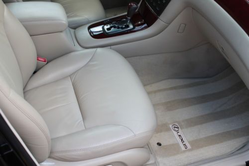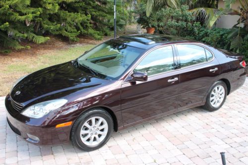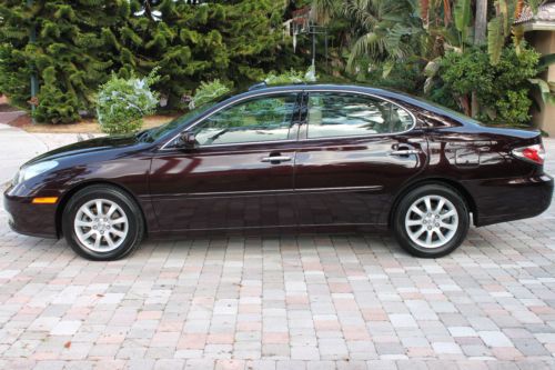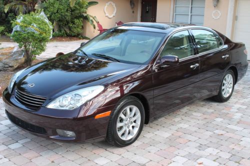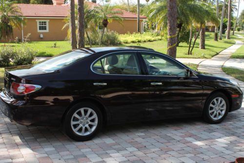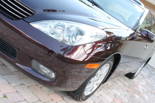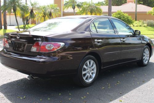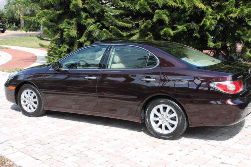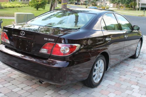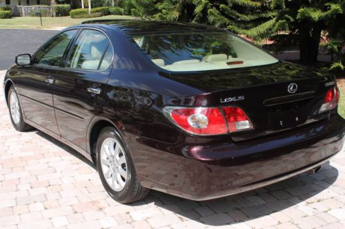 Welcome to a great opportunity. Have you ever heard of that 1-owner, very low mileage, Florida-kept automobile that was owned and driven by a little old lady, probably only to and from church on Sunday? Well, we're not sure about the religious nature of her trips, but this is that car! Simply put, this 2003 Lexus ES300 runs and drives like new. It was purchased at County Line Lexus of Hollywood, Florida and was serviced by the professionals at the Lexus dealership. No squeaks, rattles, noises, or smells, just an ultra-luxurious and ultra-smooth ride that only a Lexus can provide. There is a reason that Lexus is considered by many automotive experts as the best riding luxury brand of any of the premium automobile makers in the world. And with only 67,000 original, sunny South Florida miles, this ES300 is just getting broken in. It is not uncommon to see this extremely durable engine and transmission combination reach 200,000 miles + of trouble-free performance. It has recently had its 60,000 mile service performed and has a fresh oil change, new air filter and wipers, and interior cabin filters as well as cooling system service and flush. The air conditioning is ice cold, and for those of you in non-tropical climates, the heater works great. It even has heated seats, with multiple settings! The rich, elegant leather and wood trimmed interior is like new. The dark cherry accents really showcase the light beige leather very nicely, and the rear seats do not even appear to have ever been used. It is clean and fresh. This vehicle was never smoked in and neither the ashtray, nor the cigarette lighter have ever been used. This one-owner Lexus was owned by a senior, and while she did her best to have it regularly serviced and cleaned, sometimes the older folks here in Florida bump into a few things. We are selling this low mileage Lexus in exactly the condition that we took it in. All we had our detailer do is clean it. It runs and drives phenomenal, and the interior is extra-clean. The exterior presents a wonderful and brilliant finish, but if you look closely, you will find some imperfections. This may not bother most of you, but we do our best to accurately describe our vehicles honestly and accurately. It appears this automobile was completely and professionally repainted a couple years ago. While being a Florida vehicle has HUGE benefits--(i.e. no harsh weather, no harsh roads, no hills or potholes and certainly no snow or salt), sometimes the summer sun can fade paint. So, it is not uncommon for vehicles to be re-painted. We see it a lot. On this Lexus you can literally eat off of the undercarriage as well as the engine compartment. Both are as close to new as you can find. You will not see that on a northern, or Midwest vehicle. And then once the corrosion sets in on a vehicle from other parts of the country, things will begin to rust. Things that you can see, and unfortunately, things that you cannot see. Not the case here. This car is as clean as a whistle! So the finish is brilliant and the color is outstanding. Lexus calls it Black Garnet Pearl. It is a factory 3-stage paint process that goes into this color, making it a premium color and a $995 option from Lexus when ordered new. It looks great, and during the day, the sunlight really makes this color dance. At night it looks black. Black Cherry is the more common term we use for this color. The front bumper on the right hand side, well under the headlamp has a slight scuff. It appears she may have rubbed the wall of her garage while entering or exiting. Again, might not be a big deal to most for a 10 year old vehicle, but we are telling you about it. If interested after the sale, our cost to have it professionally repainted to like new standards is $150. There are a few nicks and scratches that you would consider consistent for a 10 year old vehicle, but you have to get up close to the car. Of course, no dents, dings or unsightly parking lot mishaps. The factory aluminum alloy wheels have a complete set of premium Yokohama Avid Endevor all-season performance radials all the way around. They are Brand new and appear to have less than 200 miles on them. Cost of these top-of-the-line Yokohama's was around $800, and they are Nitrogen filled. The rims look like new as well, with no curb rash or chips that you sometimes see. There was no skimping of the service on this Lexus at all by the previous gal! This Lexus is fully loaded. It has complete power options as well as dual power front seats, heated seats, factory power glass moonroof, express touch windows, Premium Audio System with 6-disc CD changer and 8 surround sound speakers, factory security system, solar ray factory tinted glass, independent electronic climate control and so much more. It even has a power rear sunshade. This was a rare option. Everything works perfectly and properly, just as you would expect from a low mileage, well-maintained automobile. The latest October 2013 NADA Used Car Guide shows the retail value of this 2003 Lexus ES300 to be over $12,575 and certainly much more at your friendly neighborhood Lexus dealership. This is a unique color and has a one-owner and Florida-kept pedigree. Please feel free to call or e-mail me with any questions that you may have. I am including all the original books, manuals and supplements that came with this car when new, as well as a complete set of factory Lexus embroidered carpeted floor mats. This ES300 drives and runs outstanding, it gets excellent fuel economy and is very roomy. Plenty of room in the trunk for golf clubs or multiple suitcases, and the interior provides comfortable seating for 5 adults. This is a sensational car to take on a long road trip. With only 67,681 original miles, this Lexus was used sparingly. That's less than 6,500 miles per year. And again, very easy miles by an older owner, and pleasant Florida roads. Don't make the mistake of missing out on this rare find. We are running this auction for 7 day