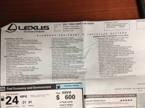 2013 Lexus ES350 Silver with Black interior 9000 miles. Blind Spot monitors 18" wheels HID headlights ULTRA Luxury package: Navigation Mark Levinson 835 Watt Premium Audio Backup Camera Voice Command Remote Starter Plus More!!!!