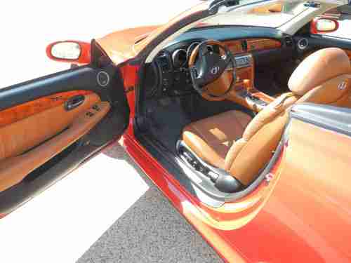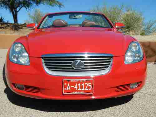 2002 Lexus sc430 hard top convertible in rare red with saddle interior and upgraded original factory TRD (Toyota Racing Development) chrome aluminum wheels. This car is completely unmodified with paint and interior in like new condition with no cracks, rips or stains and the engine and transmission run flawlessly on the newer Pirelli run flat tires. The Lexus has just turned 90k miles and is loaded with dual power memory leather seats, Mark Levinson sound system, touch screen navigation, heated seats, power everything with remote entry, and the 300hp stock 4.3 liter powerful V8.