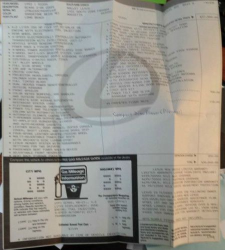 This car belonged to my farther, he recently passed away, he was the original and only owner and keep this vehicle in his garage. We have all the records and information from the day he purchased it. We purchased new tires and rims for this car but have the original rims in boxes for the new buyer to have. Car runs great only issues we noticed were the driver window is off the track and needs to be put back on. Small dent in driver door, looks like someone opened door into in parking lot. Car and engine look in perfect condition. Good Luck bidding THIS 1992 SC400 IS IN AMAZING CONDITION, ALWAYS GARAGE KEPT, 1 OWNER, ONLY 90K ORIGINAL MILES, ALWAYS DEALER SERVICED, POWER EVERYTHING, SUN ROOF, HEATED SEATS, POWER TILT WHEEL, ORIGINAL WINDOW STICKER, BOOKS AND 3 KEYS! THE BATTERY IS BRAND NEW, TIRES ARE NEW. THE CAR RUNS ABSOLUTELY NEW! THE FLAWS ON THE CAR: DRIVER SIDE MIRROR IS CRACKED (FOUND A COUPLE OF THEM ONLINE FOR $35 USED), THERE ARE LITTLE DINGS HERE AND THERE AND SOME CHIPS AROUND THE CAR . PLEASE KEEP IN MIND IT IS A 1992 BUT OVERALL IT IS IN GREAT CONDITION! YOU ARE MORE THAN WELCOME TO HAVE YOUR MECHANIC COME LOOK OVER THE VEHICLE IF YOU WOULD LIKE TO. Included Standard Equipment Interior