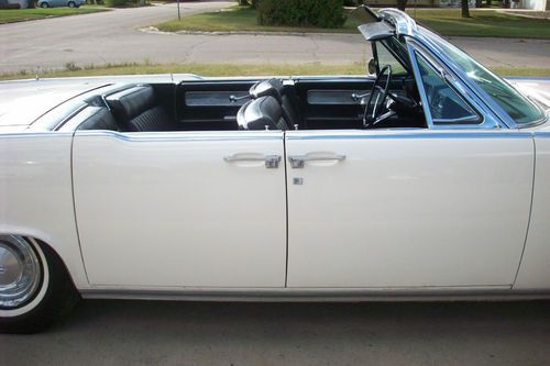 1961 Lincoln convertible. Purchased from an estate, this car was in storage for almost 20 years. It was represented to me, by the former owners friend, that the miles are actual but I cannot verify. Beautful black leather interior is in remarkable condition with leather soft and flexible and seat padding soft and firm. Dash and pad are near perfect. Carpet is new but the rest of the interior is original and very nice. Body is sound with some very light rust in isolated spots (see photos) but no rust-through anywhere on car. Right quarter appears to have had some body work done above the rear wheel. Car has been repainted it's original white but paint is a ten footer or a nice driver. Grille is perfect. Brightwork all in good condition. Tailight will be replaced before end of auction. Car runs, drives and shifts very well and could be driven anywhere with a new set of tires. Brake system has been overhauled. Fluids changed and fuel system cleaned. All lights and electrical components work correctly including all power windows and power seat. Radio, heater, speedometer, wipers and all gauges work correctly. Power top and trunk lift work correctly. Vacumn power locks do not work. Top is original and probably will need to be replaced in the future. Car is located in Austin, Mn. and available for a test drive anytime during the auction. If you cannot inspect before end of auction the buyer, after paying deposit via paypal, will have ten days to inspect and pay for the car. If the buyer upon inspection does not want the car for any reason one-half of his deposit will be refunded. I will assist in locating shipping for the buyer if needed. Any questions please e-mail or call 507 279-0752. John