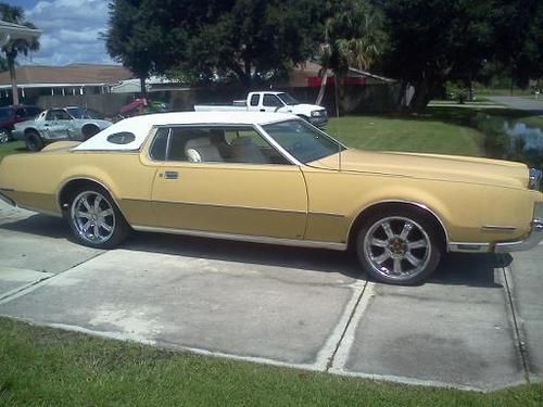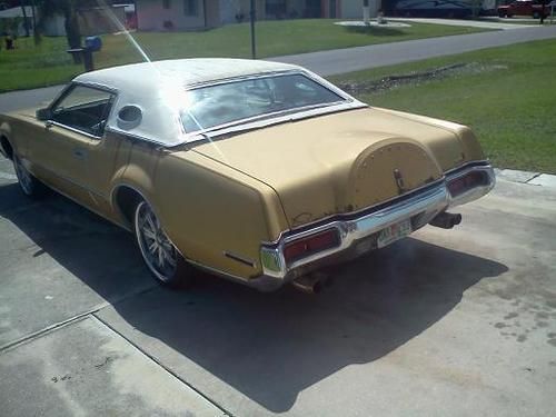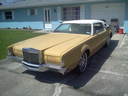 1972 Lincoln Continental Mark IV, unrestored mostly original condition, vehicles weighs just short of 5,000 lbs of All-American sheet metal. Engine 460-V8 7.5 liter is original and unrebuilt except for replacement carburetor. 1972 was the first year for engines with hardened valve seats to run on unleaded gas but was the last year before compression ratio's went down. 1972 is considered the last year of the american muscle car. There is no catalytic converter or emissions required on this vehicle (except in California). Starts and runs well, burns some oil but doesn't knock, the engine still has A LOT of power and torque even though it is 40 years old. Transmission attached to motor is also original and shifts nice and smoothly and reverse gear works fine. I have driven the car and it mostly works well, turn signals, brakes, etc... but I noticed that when it shifts through the gears the back end of the car feels like it 'moves' a little bit and is an unsettling feeling. A/C works and doesn't make any noise but it needs a re-charge (R-12). Power Windows and Seats work except the drivers seat won't move forward or back but it still will tilt. The paint is original and body appears to NEVER have been worked on. There is body cancer above the rear drivers wheel and also around the back window and trunk, the buyer needs to look at the car to determine what they think the extent of the rust damage may be. A brief inspection of the underside looks ok with some rust but not very much rot or cancer. The wheels that came on it are chrome 20" and are pretty much junk and need to be replaced, the tires do have tread on them. Bids start at $1000.00 and the buy it now price is $3000.00 there is NO RESERVE. FULL PAYMENT DUE WITHIN 72 HOURS OF AUCTION CLOSE, deposits are non-refundable. all statements about vehicle condition are believed to be true by seller but vehicle is sold 'AS IS' WITH NO WARRANTY OR GUARANTEES. owner/seller contact Jack (941) 661-1848 in sunny Port Charlotte, Florida.